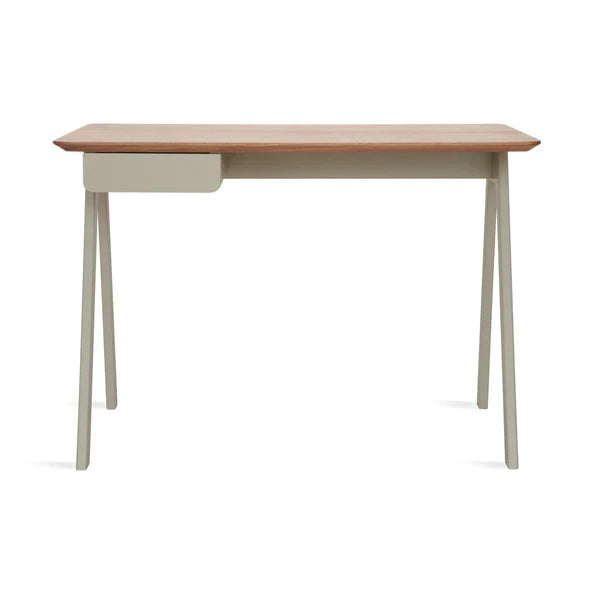 • Walnut / Putty Grey: Stained walnut veneer top with painted solid wood legs