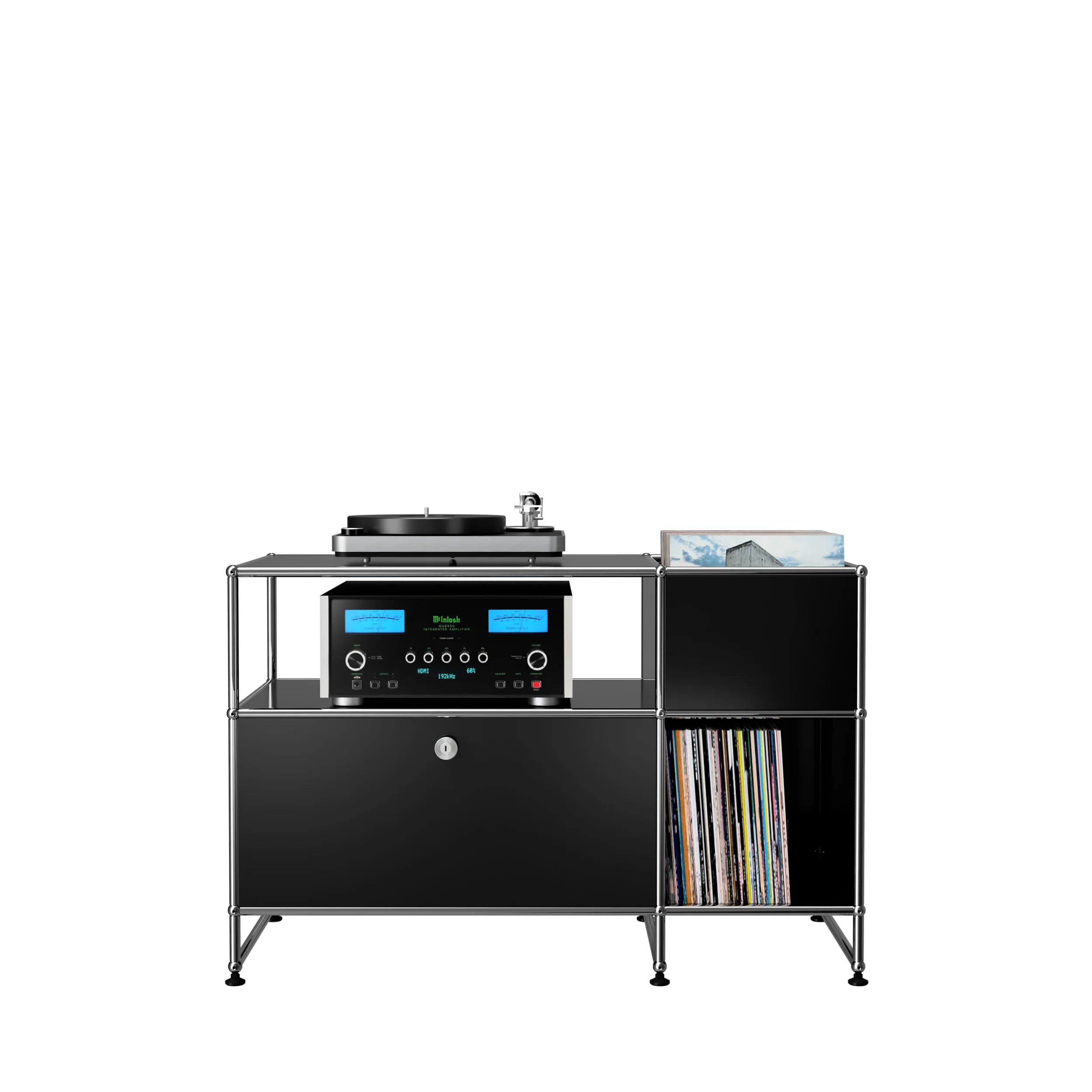 The USM x Symbol Record Stand is an incredibly efficient way to integrate an all-in-one vinyl listening station into your home. The expandable system can accommodate both casual listeners and hardcore audiophile collections. Flip bin allows for larger vinyl collections and casual browsing. The 45” Record Stand offers an all-in-one solution to store up to 300 records, audio components, and a turntable. Soft-close drop-down door.