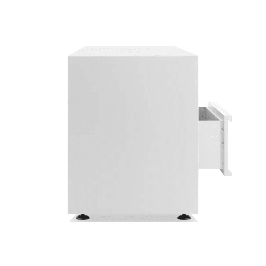 Tranquil staple. Crisp lines and unassuming relief pulls conspire to keep the action behind soft close drawers. A matte painted finish in muted tones delivers serenity and sets up a streamlined storage solution for the living room, bedroom and office.