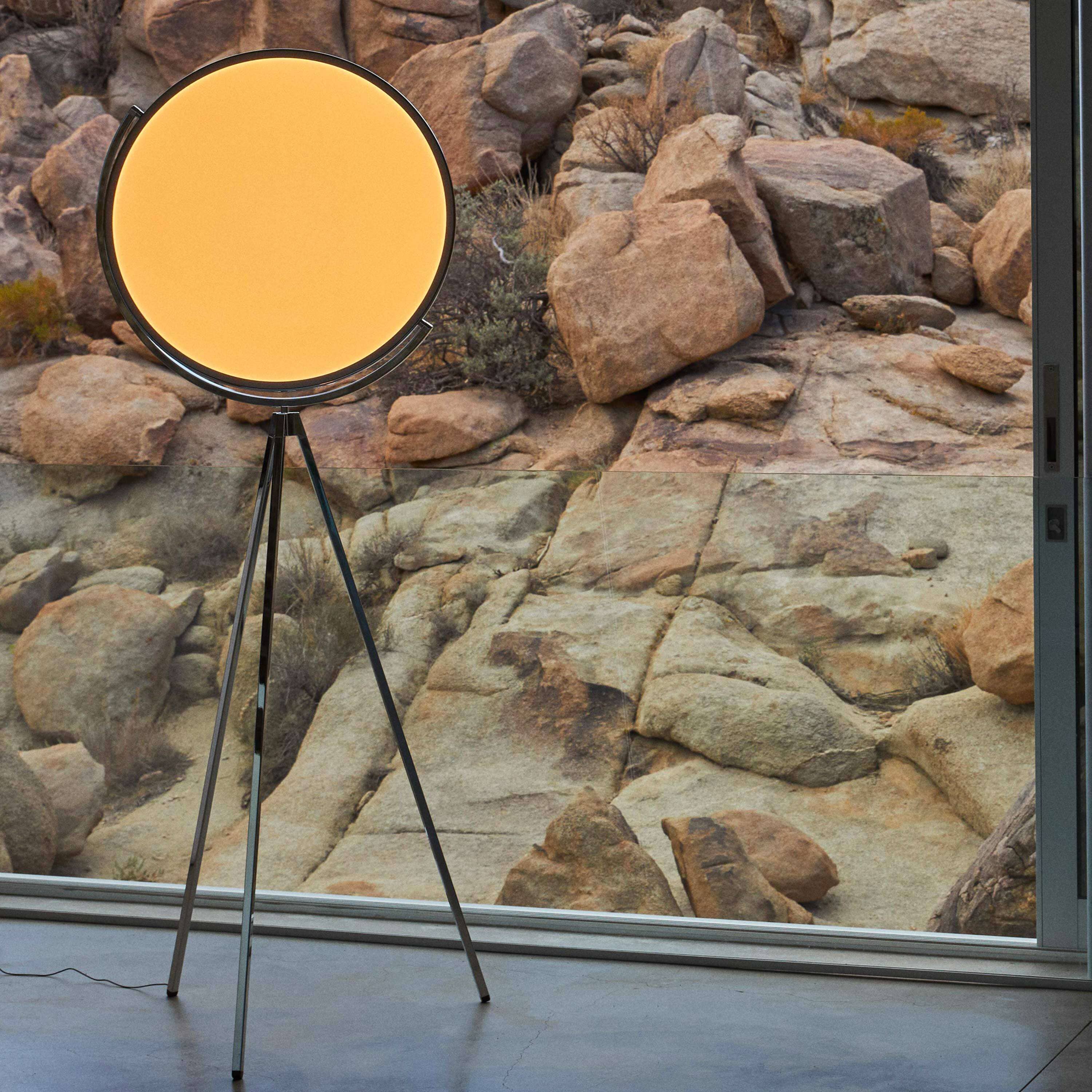The serene, harmonious glow of the moon inspired this innovative and first-of-its-kind design from artist Jasper Morrison. Using revolutionary Edge Lighting Technology, the Superloon combines maximum performance and efficiency with visual comfort. This striking floor lamp includes a Dim-to-Warm function that responds to adjustments in intensity: As it dims, light transitions from a colder blue to a warmer tone, as with a well-loved filament lamp.