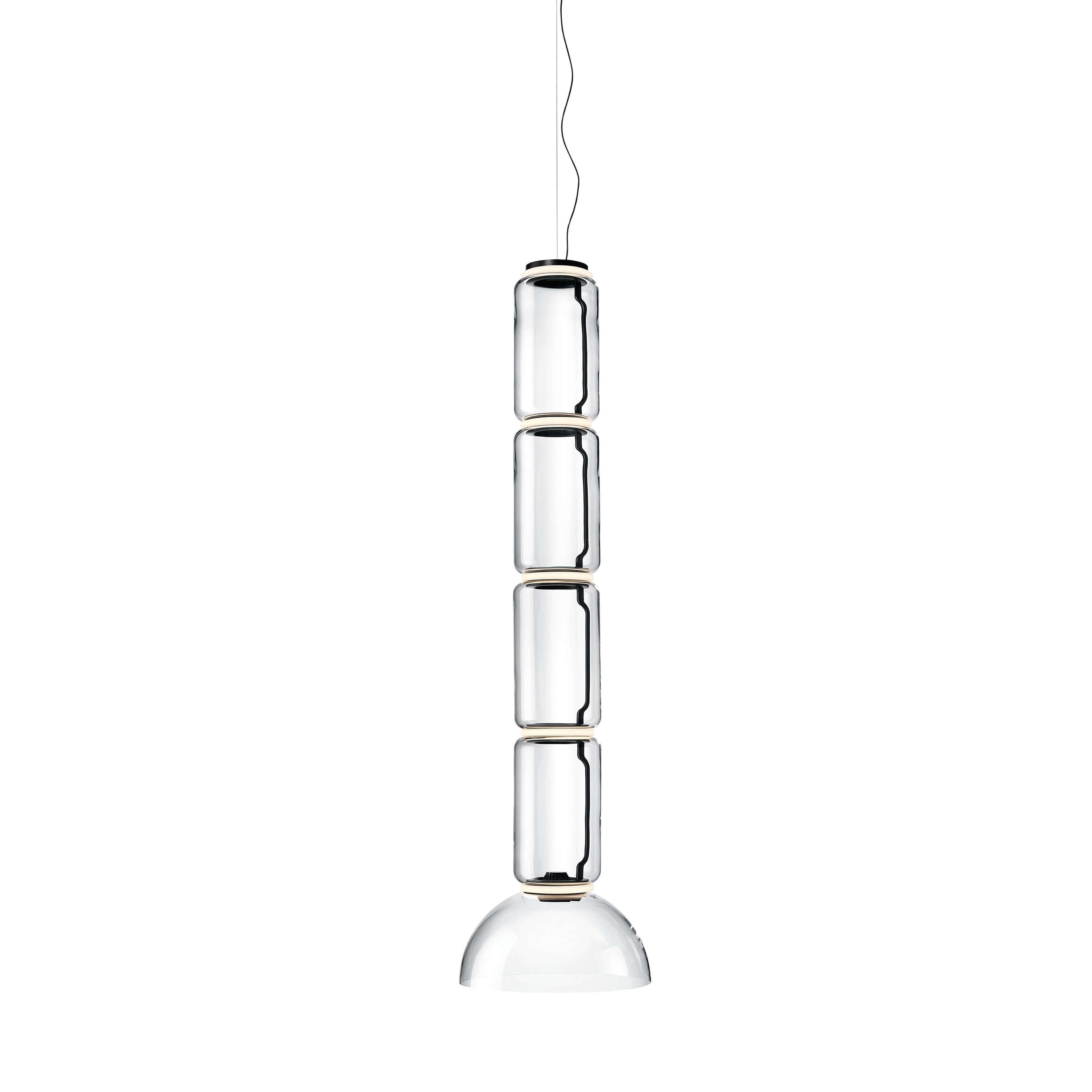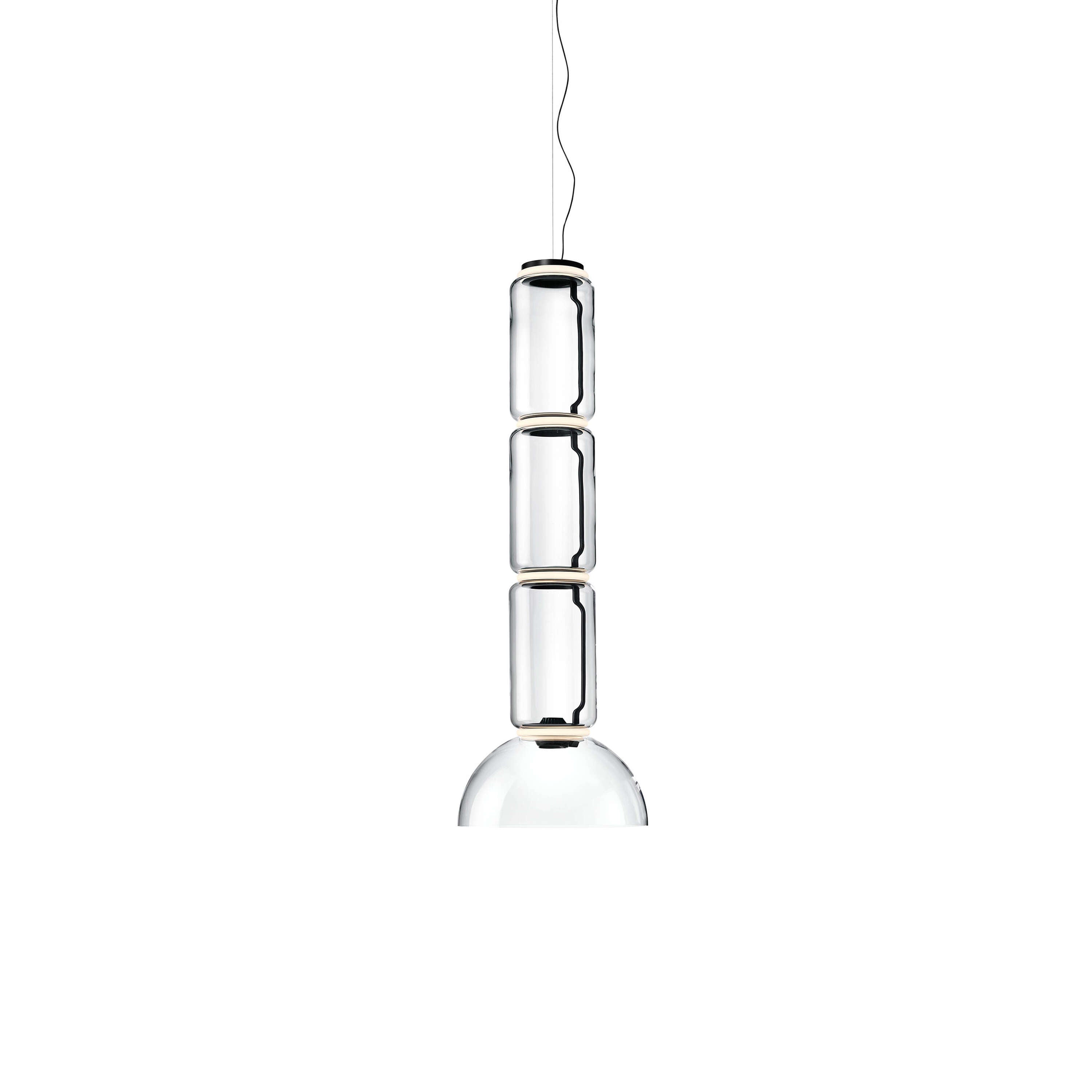 Hanging lamps consisting of interconnecting glass modules reaching a length of 3,2 mt.(126.77") with 4 mt. (157.48") suspended power cable. Cylindrical and semi-spherical transparent blown glass structure, suspended die cast aluminium ring connector, hydroformed steel internal lateral arm and injection moulded optical opal silicone outer ring diffusers. The power supply unit within the ceiling rose can be used as a dimmer to adjust the light intensity by 10% to 100% in either direction by means of the 0-10/1-10V, PUSH, DALI control.