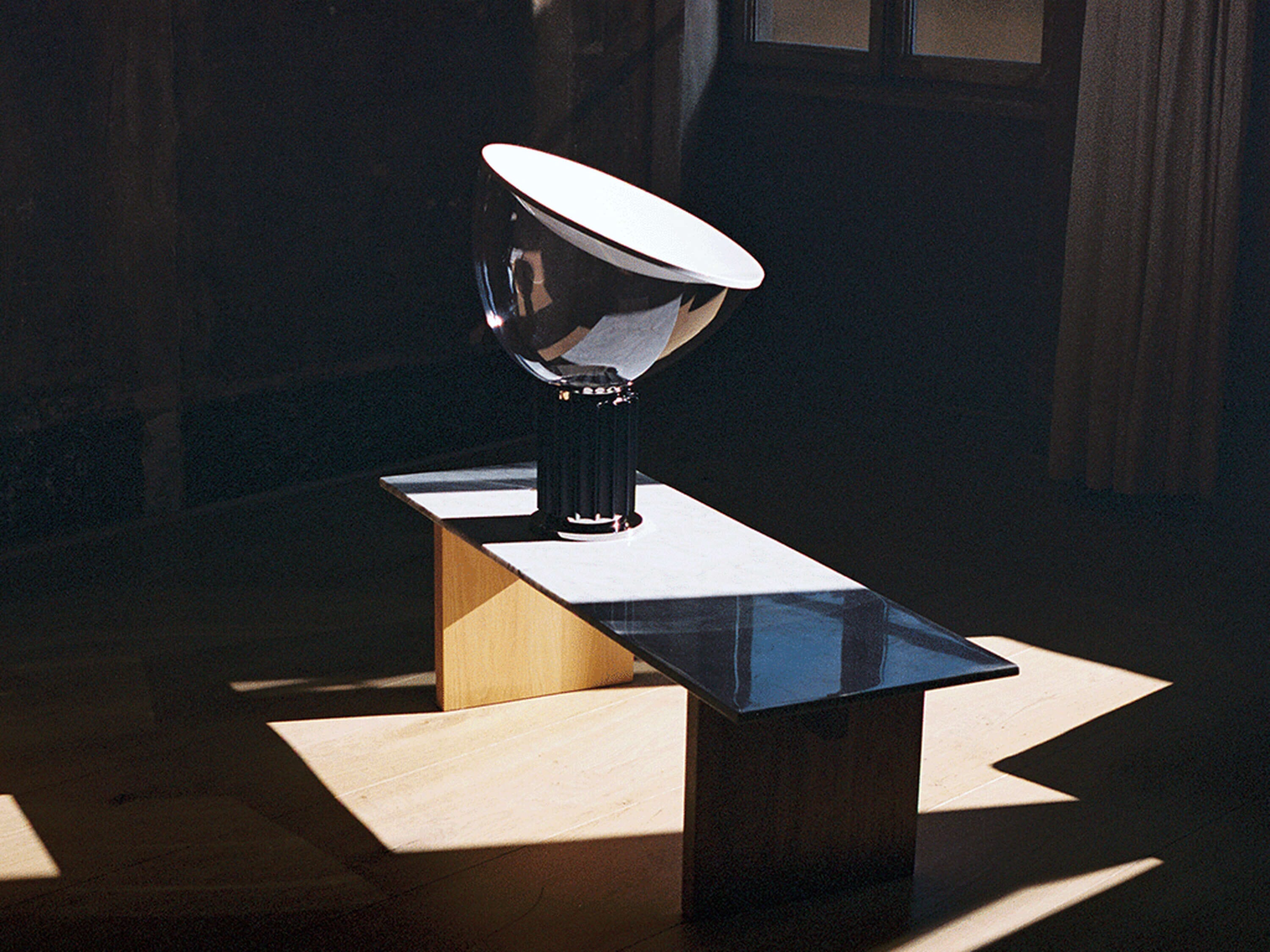 The TACCIA table lamp has a concave spun aluminum reflector with a matte white finish. The light can be adjusted by positioning the blown glass diffuser as required. The base is made from extruded aluminum and is available in an anodized matte black or natural sandblasted finish.