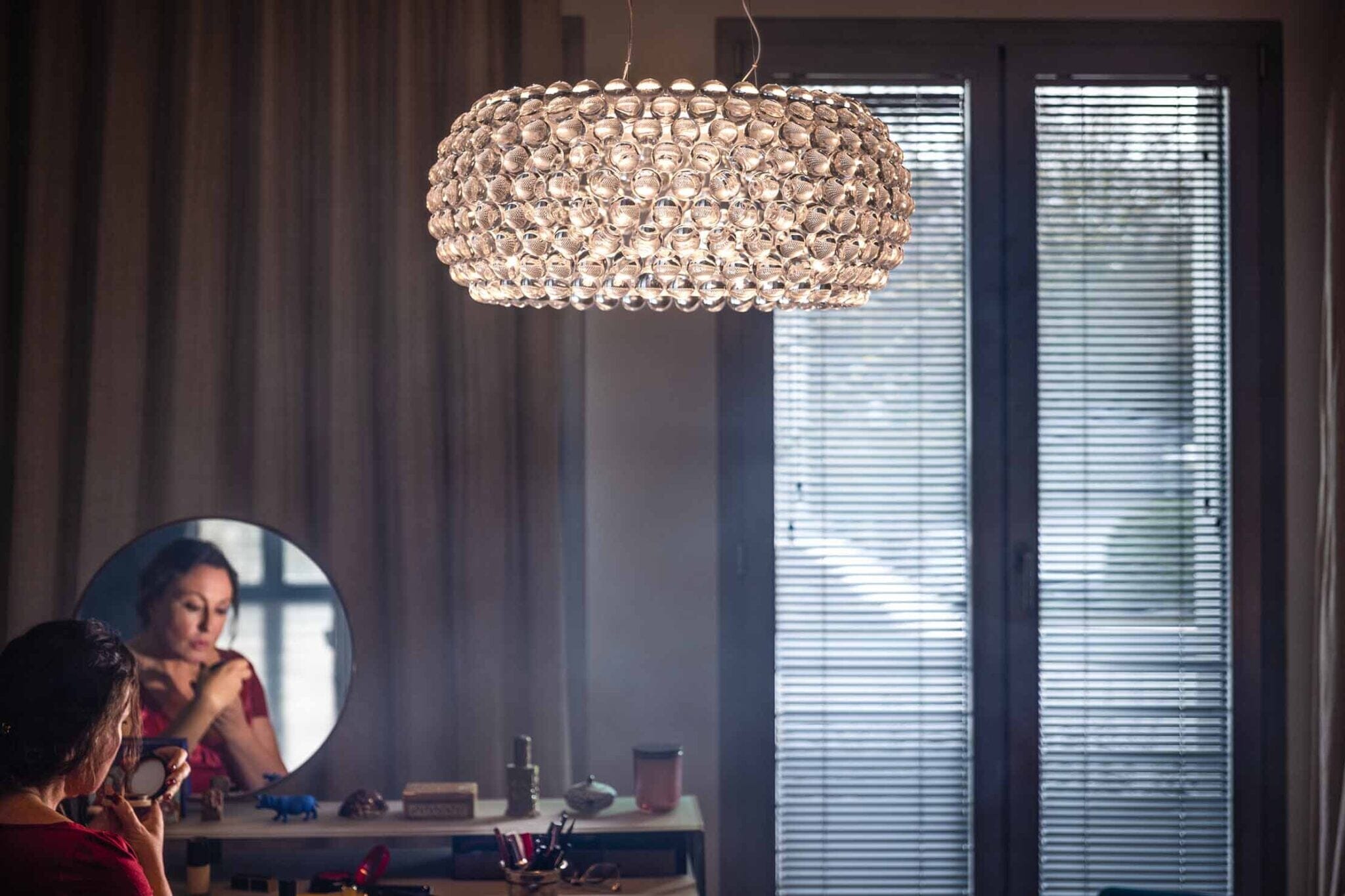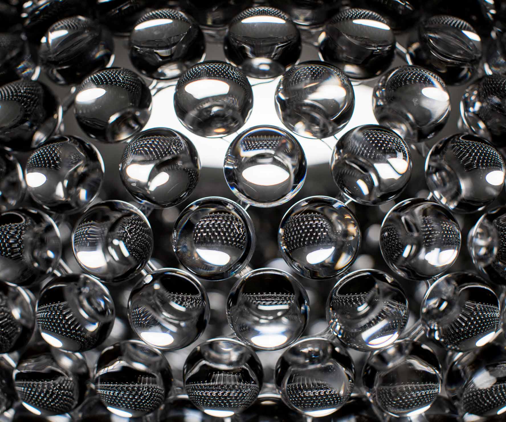 Sophisticated, brilliant and multi-faceted, the Caboche ceiling lamp is a mosaic of refractions, a perfect fusion of various personalities within a single form, that combine to create the body and lighting effect of the lamp. The transparent polymethylmethacrylate balls multiply the brightness of the central lighting source and being arranged with a characteristic ring layout, they allow strong lighting reflected off the ceiling and directed on to the surface below. The lighting source is left free to illuminate all around: the upper matt white glass screen guarantees optimum diffusion of light upwards, and the lower screen has a concave form to shield the bulb and prevent dazzling, thus making Caboche ideal for use above dining room tables. Furthermore, despite its high personal charge, the lamp's transparency multiplies colour combination potential, for use in the home or in sophisticated, exclusive public areas. In the new LED versions, affording high energy efficiency levels and durability, Foscarini wanted to retain all the emotion of the original model. For this reason, after a lengthy lighting technology design project developed by Foscarini, the new version with LED light retains the unmistakable effect of this lamp, in which every sphere recreates the image of the light source inside it and of its surroundings.
