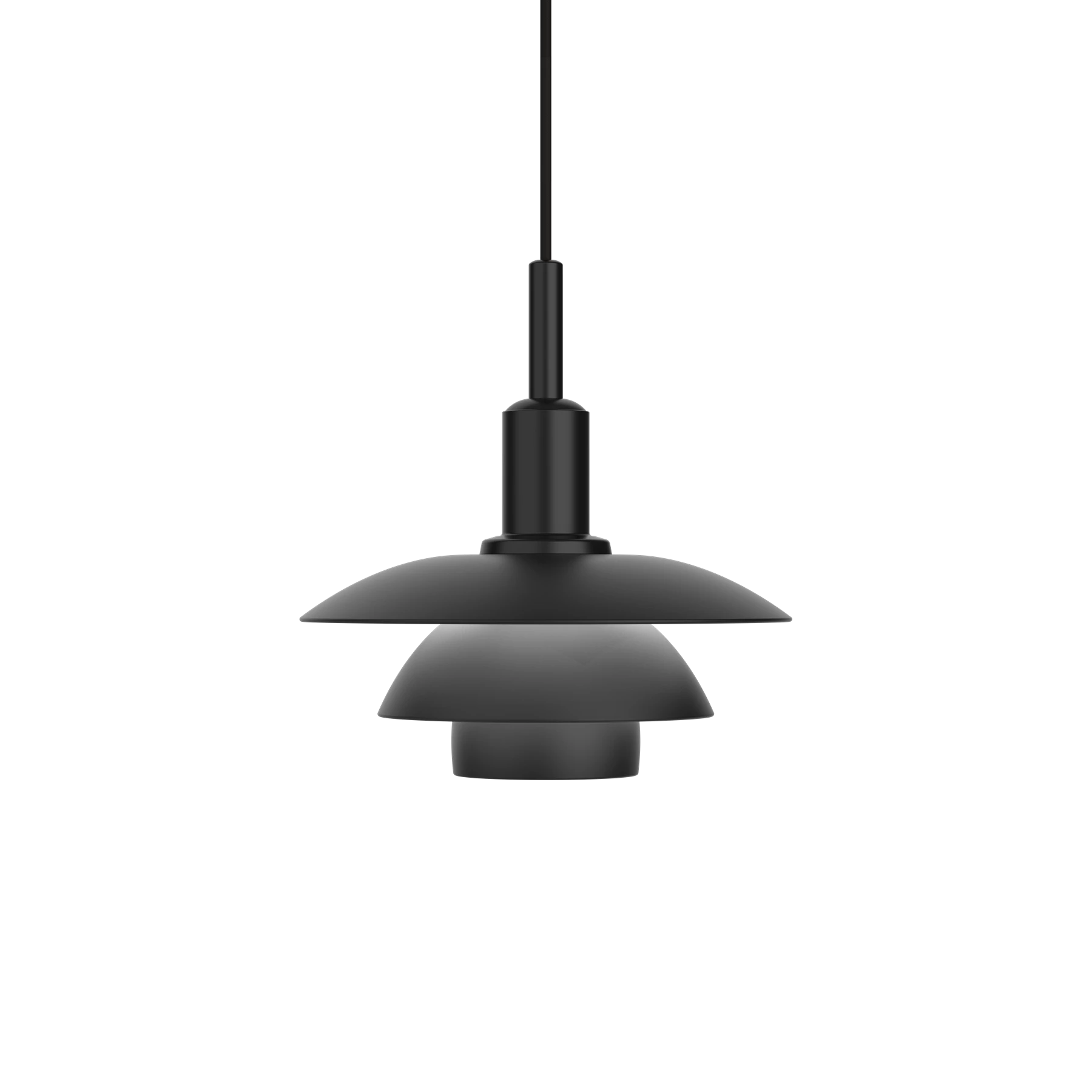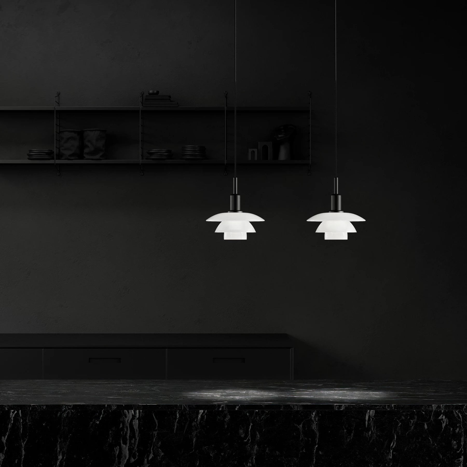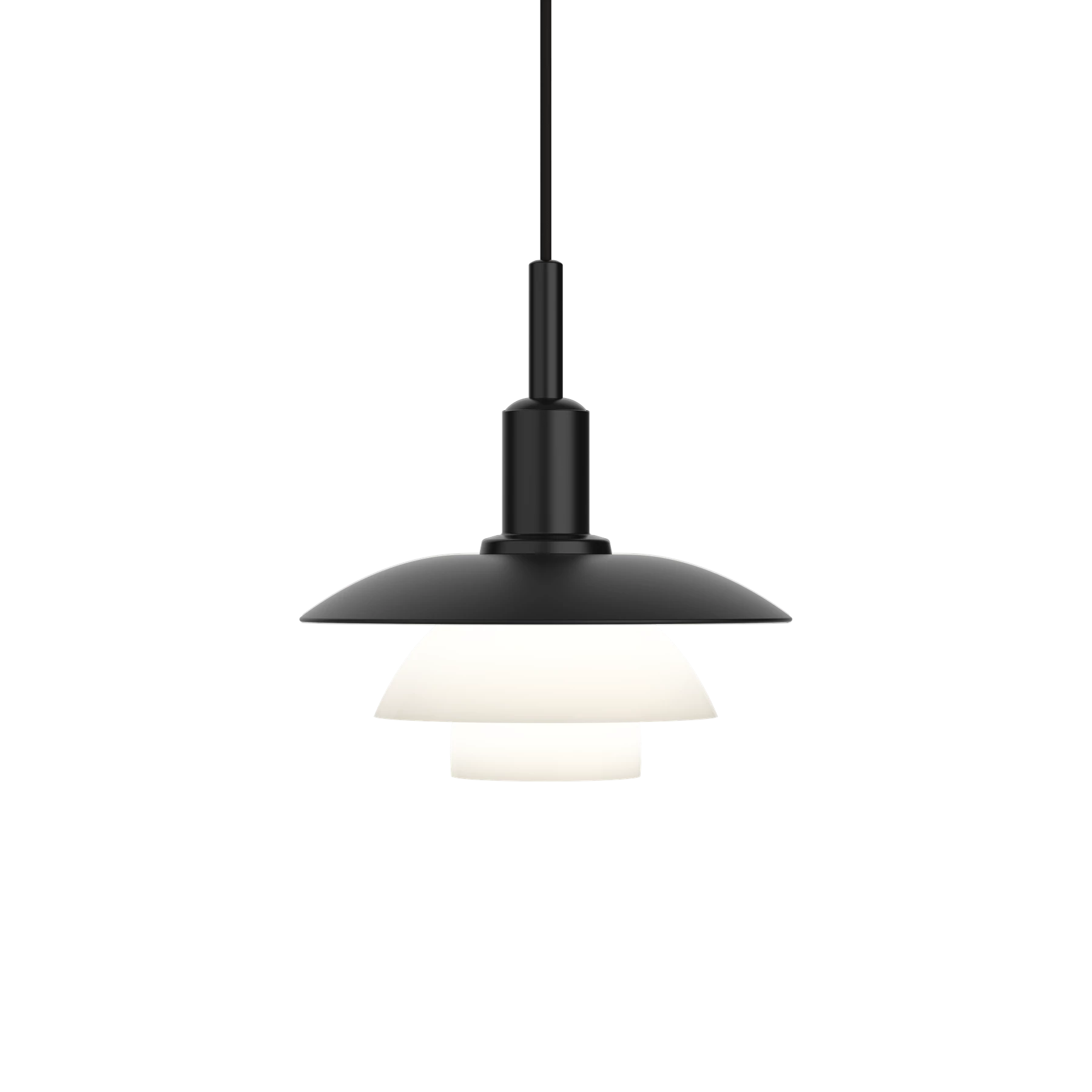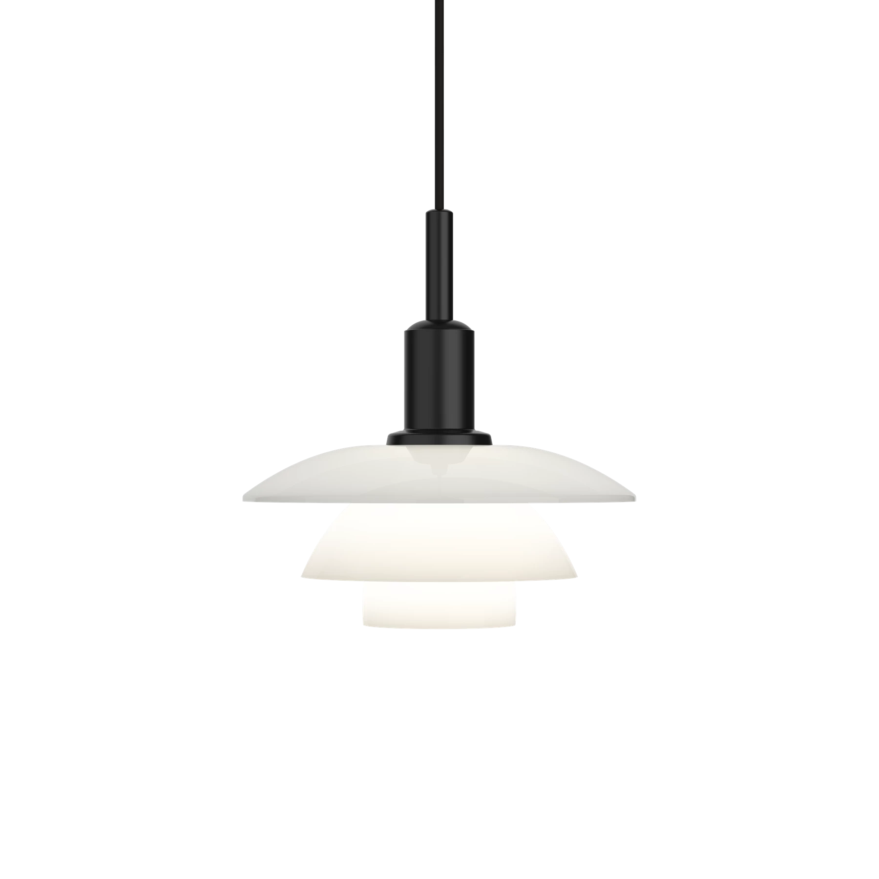 Material: Top shade in soft touch black painted aluminium with white inner side. Middle and lower shades in mouth-blown white opal three layer glass. Suspension unit in matt black powder coated aluminum. Includes a specially designed matt black canopy. Cord length: 4m. Cord type: Black textile. Height adjustment of light source approximately 25mm depending on light source used. The included diffuser in frosted glass is easy to insert for an even softer light distribution. (RAL RAL 9005)