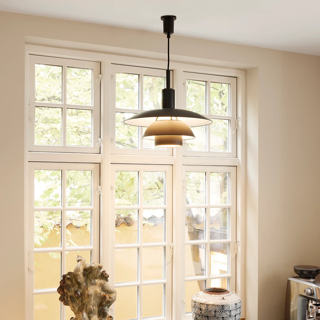 The fixture emits a comfortable, diffused, glare-free light that is characteristic of Poul Henningsen's reflective three-shade-system. The fixture is available with white opal glass or soft-touch black-painted metal with a white interior. The translucent shades in triple-layered, hand-blown opal glass create a warm glow around the pendant, whereas the metal shades with their white-painted interiors reflect a fine and primarily downwardly directed light. An optional translucent white diffuser (included) is easy to insert for an even softer light distribution.