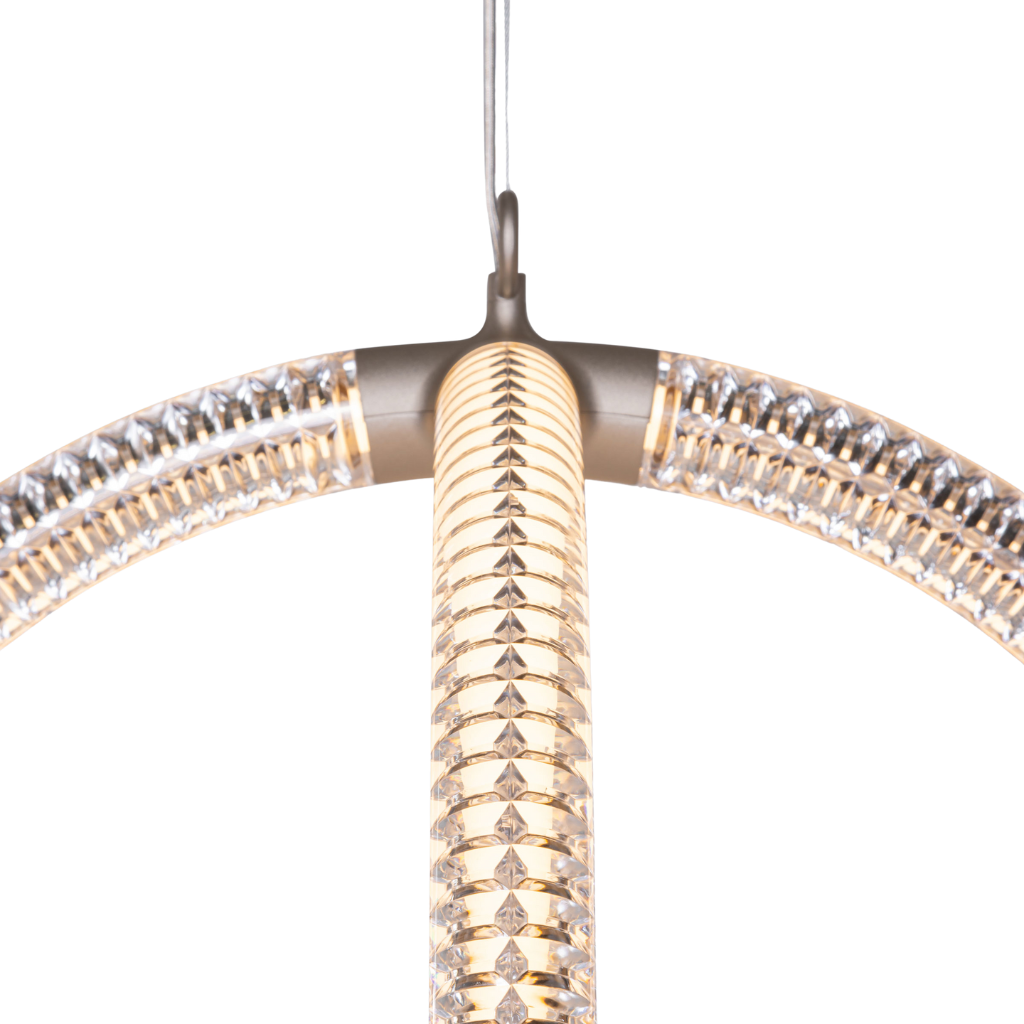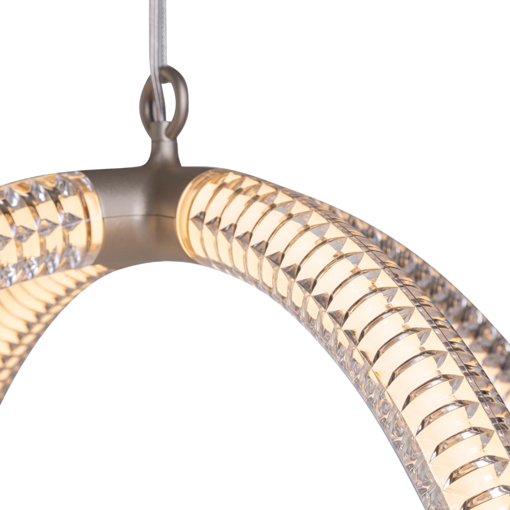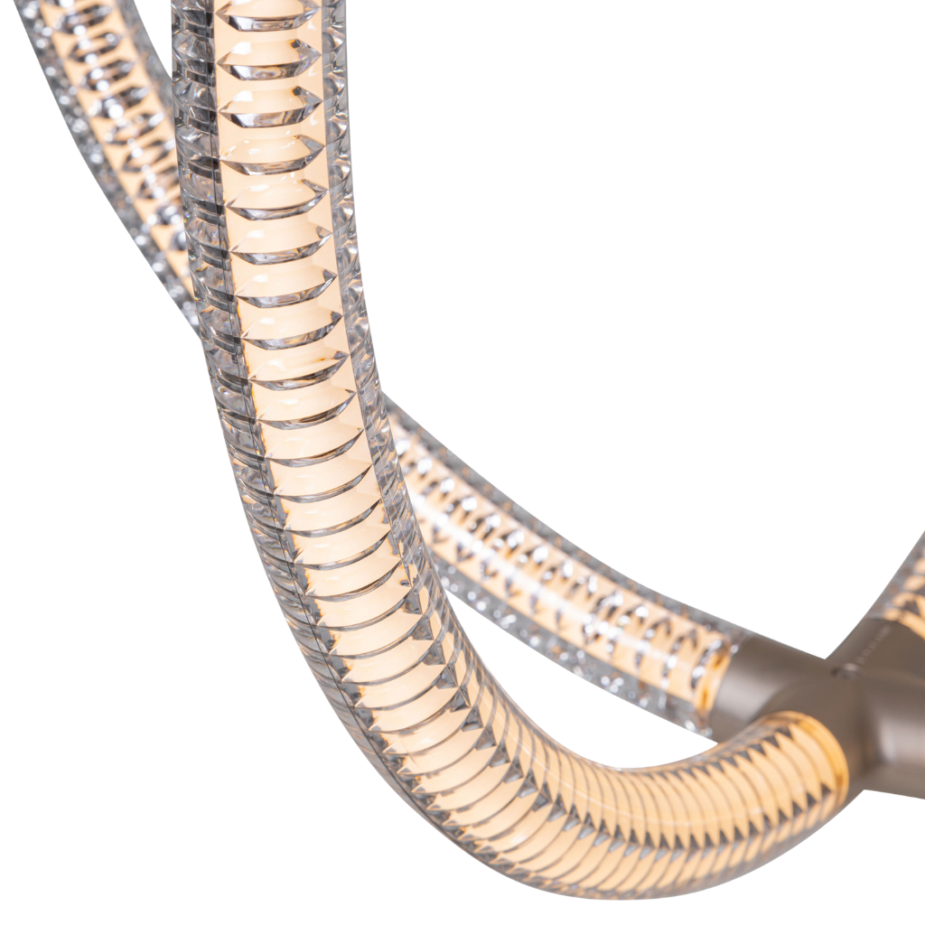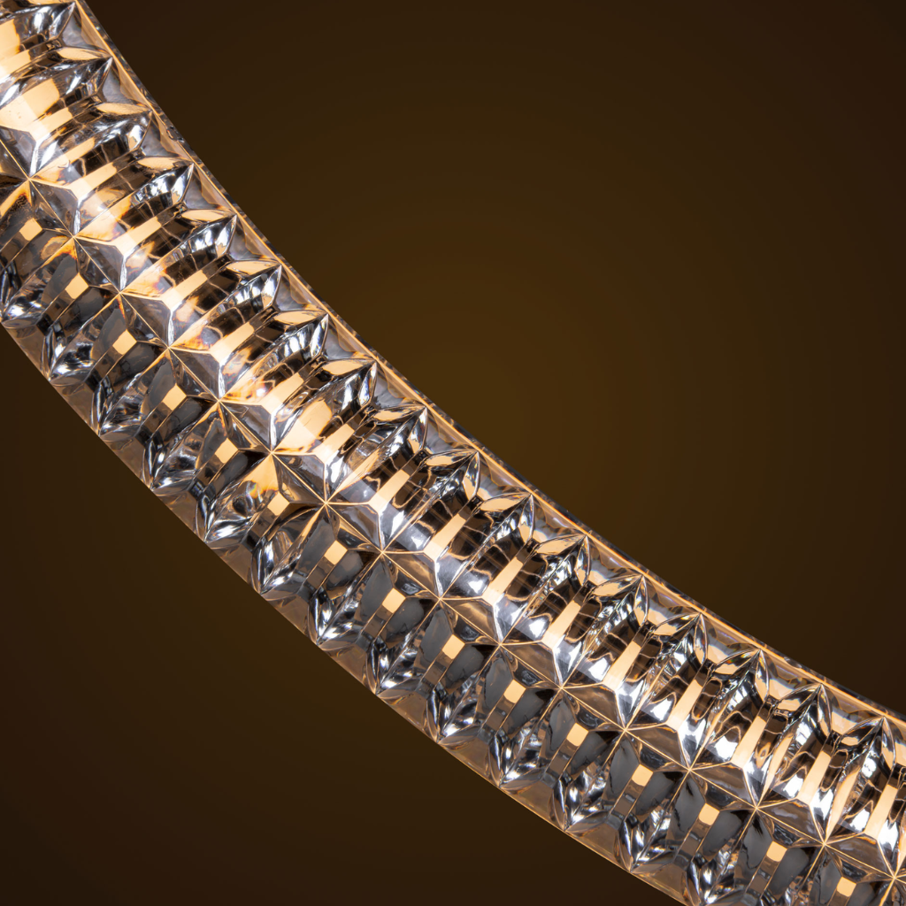Inspired by the grandeur of Murano glass and mathematical elegance of the golden ratio, Luminora Light merges craftsmanship with modernity. Its floating design embodies simplicity and complexity, creating a luminous sculpture where the structure is light itself. The V-shaped diamond optical pattern and transparent LED tubes produce a mesmerising effect.