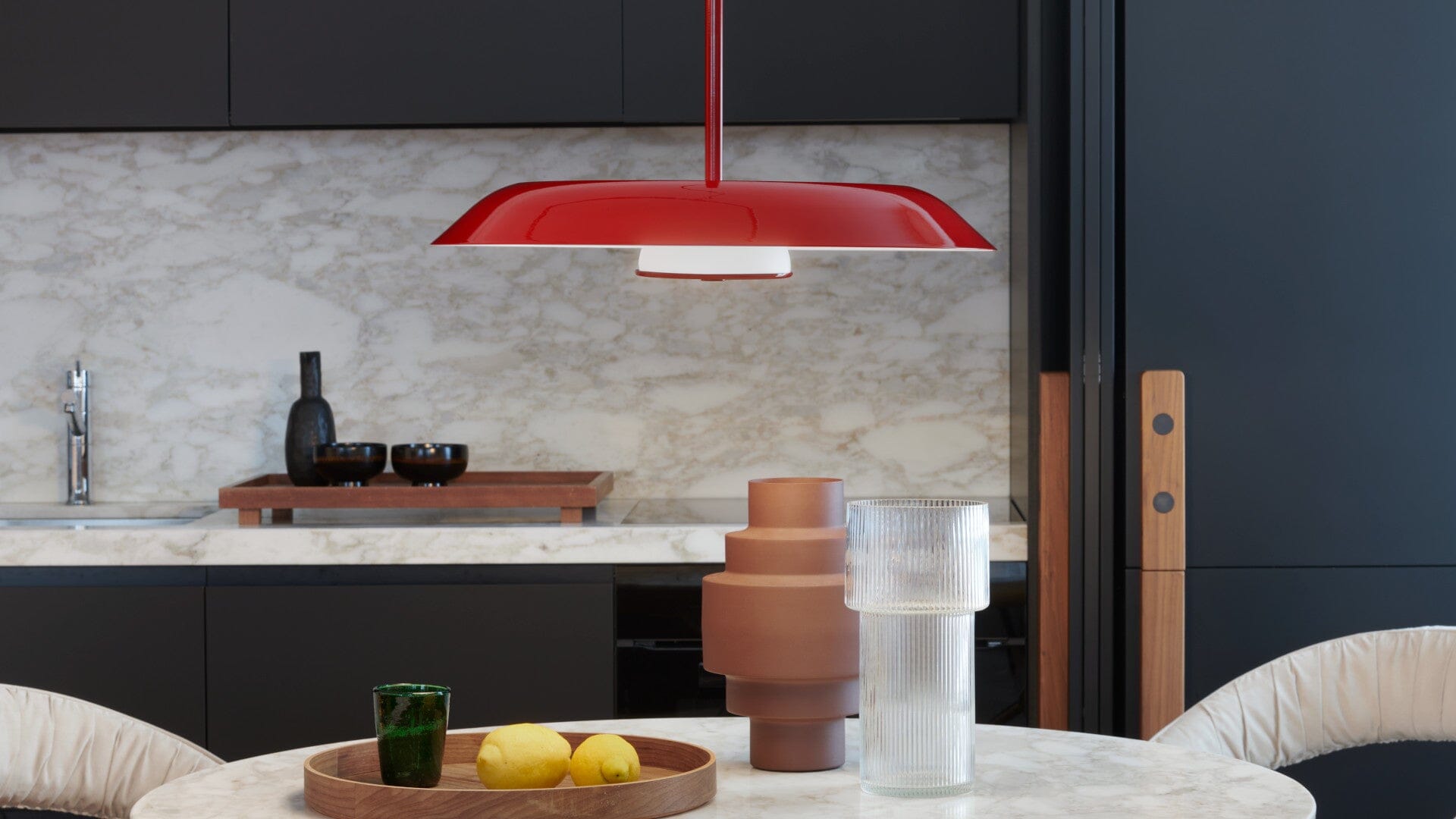 With its soft light and low-profile silhouette, Iride is a lamp that renews the archetypal form of dome lighting using a contemporary language. Two suspended lamps with different sizes for a chosen and sought-after lighting effect that gives the lamp harmony, ensuring uniform diffusion and visual comfort within rooms. The central opaline glass diffuser becomes an element with personality, drawing the stylised shape of a drop in the centre of the minimalist dome on which it rests. The light diffuses due to the lampshade reflection and comes out softened. An interior lamp designed for homes, Iride is available in a total white version or in two colours: reflective white inside, black or glossy red outside.