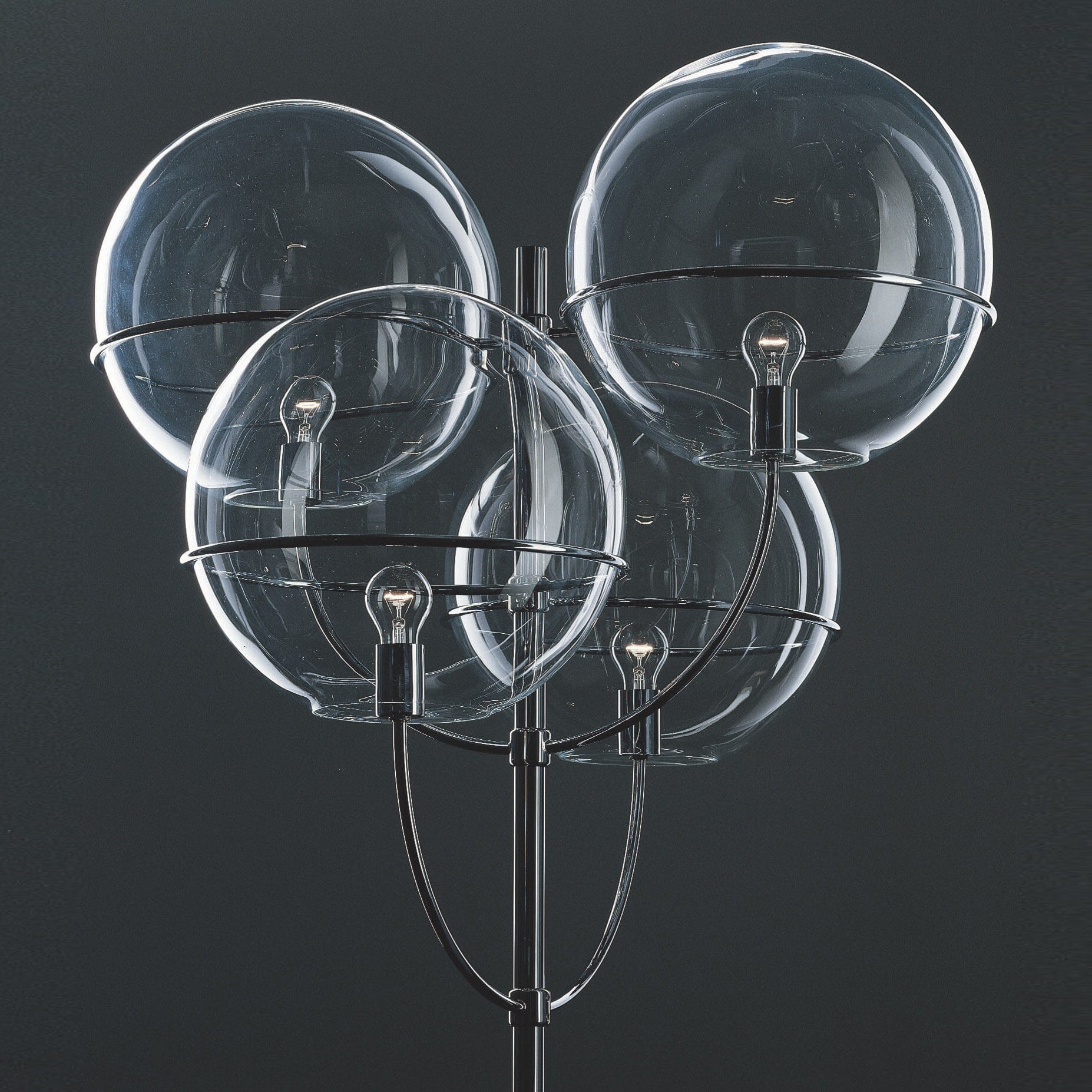 The chrome-plated finished candelabra-style body, typical of the family of lamps designed by Magistretti, can, from time to time be bent according to the required use of the lamp, extending to enclose the transparent glass spheres, inside which the light bulb is hosted.