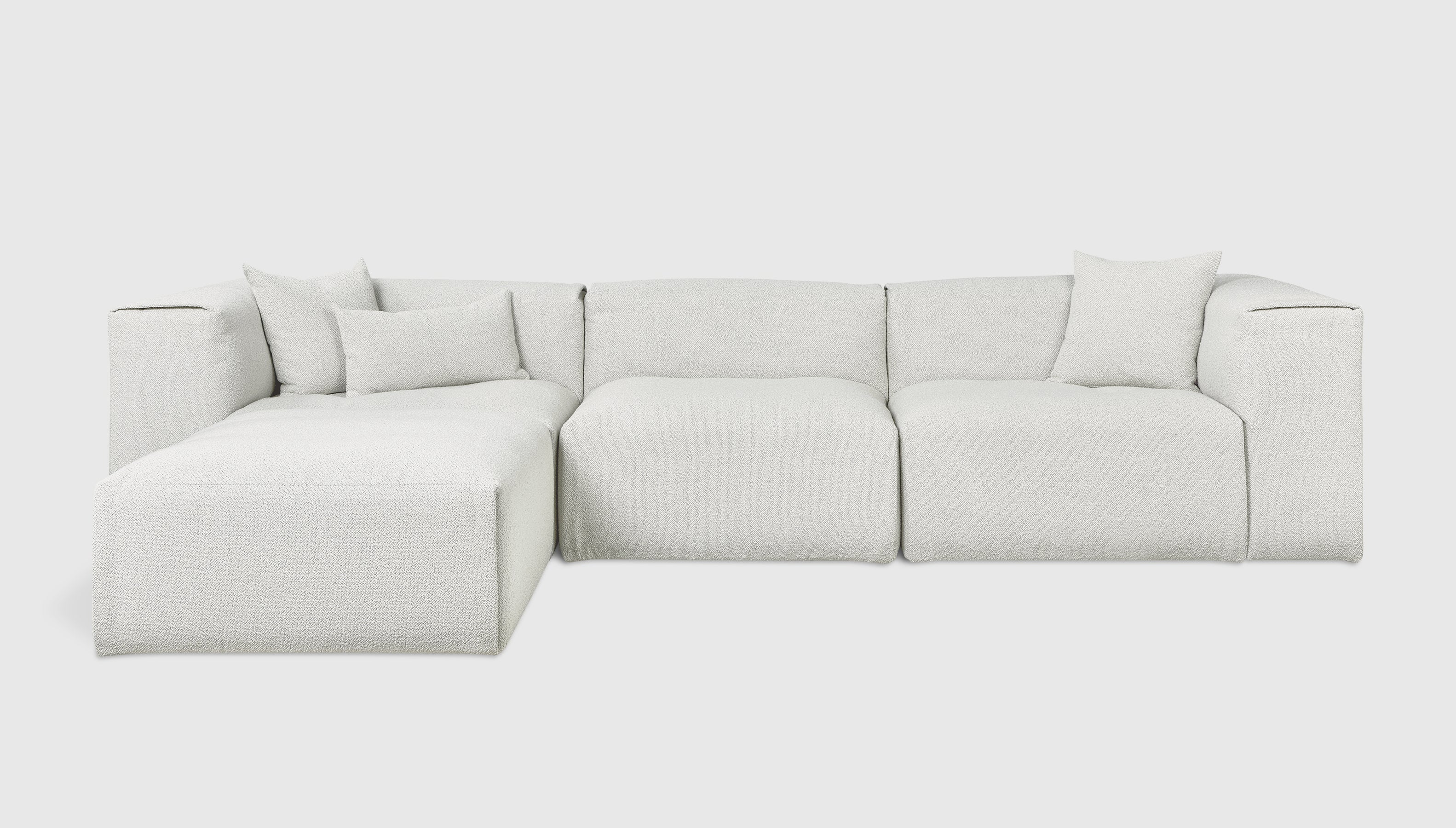 With plush comfort and a sophisticated, structured shape, our innovative Nest Modular Series invites you to sink in and stay awhile. The epitome of easy luxury, this versatile collection features five core components (Left Arm, Right Arm, Corner, Armless, and Ottoman) that offer near-endless configurations, allowing you to tailor your lounging experience to your evolving lifestyle. Each piece touts a plump low profile (courtesy of premium feather fill) encased in nubby bouclé fabric, with a Scandinavian-inspired modern shape that is versatile enough to hold court in a beach house, mountain escape, or boutique hotel lobby.
