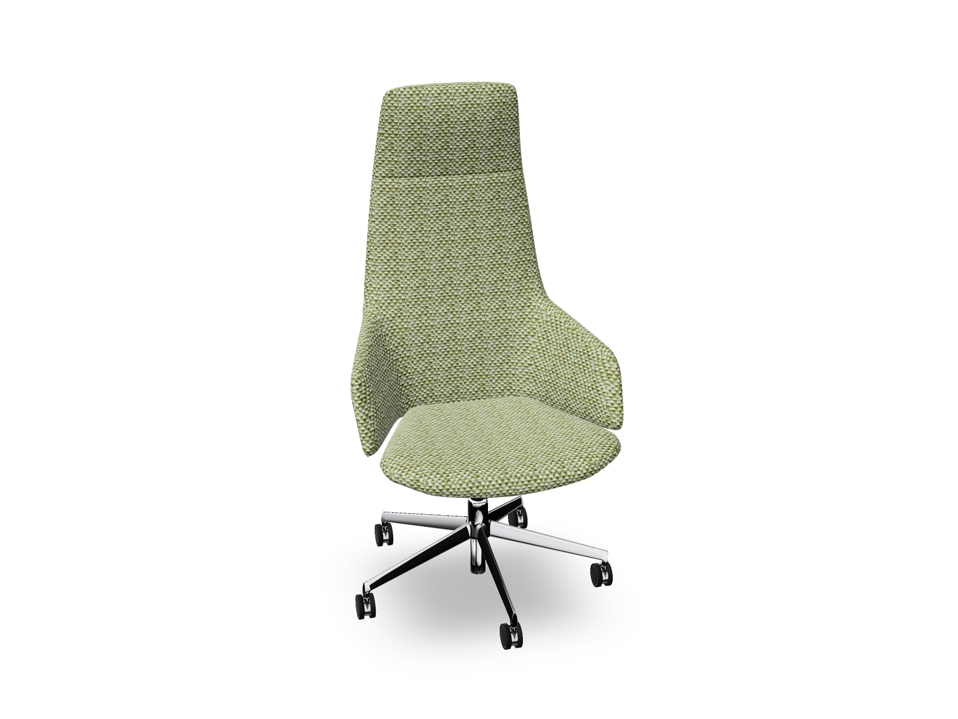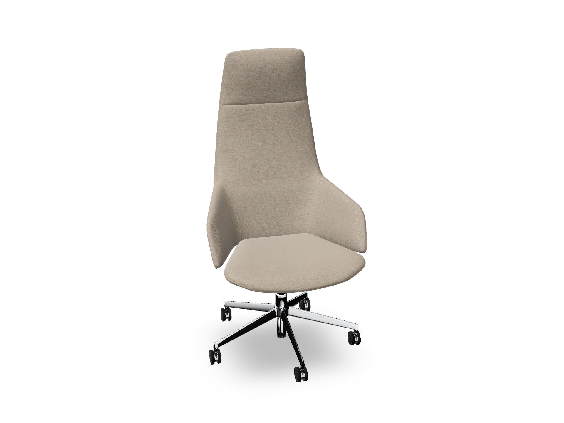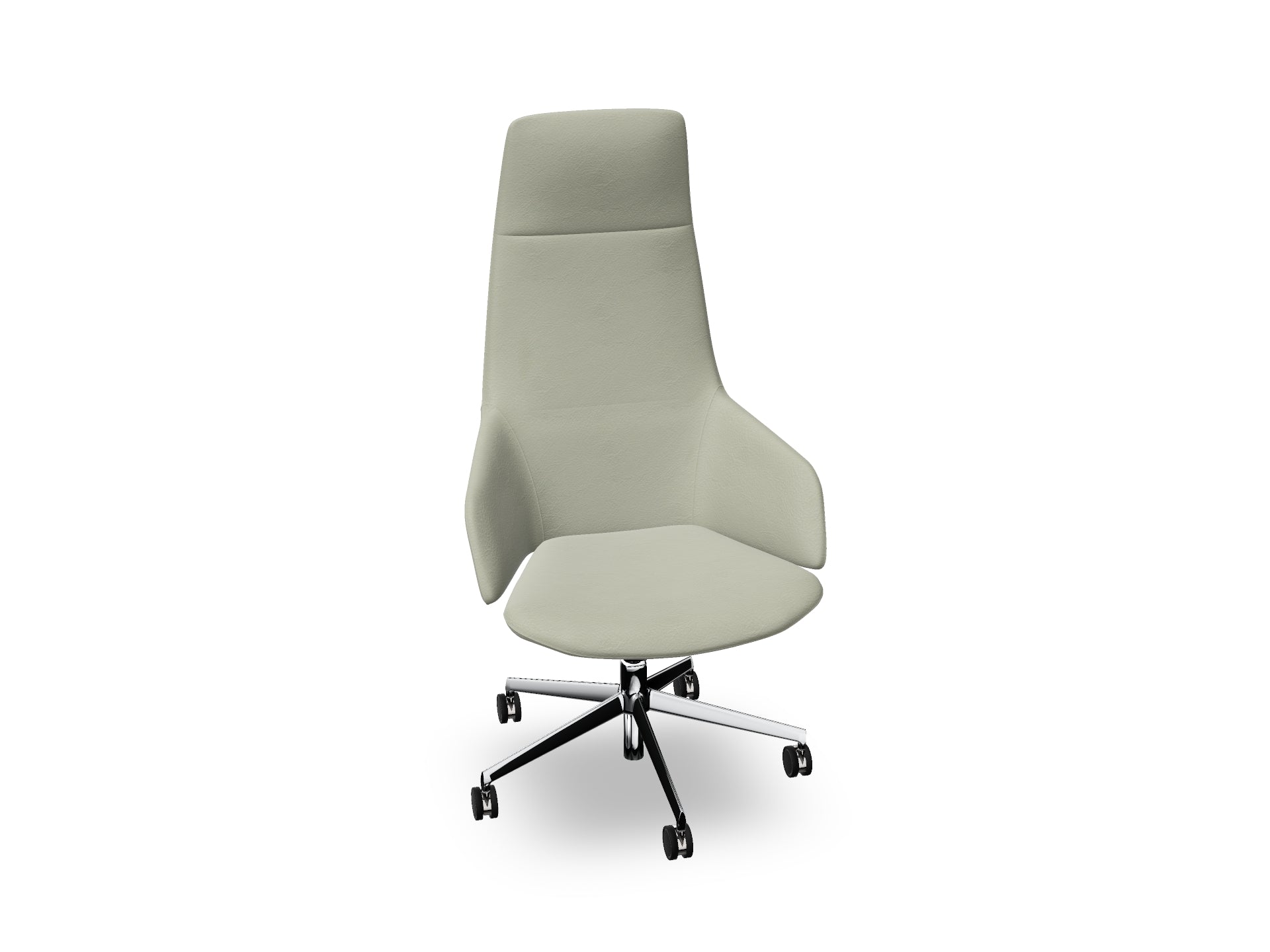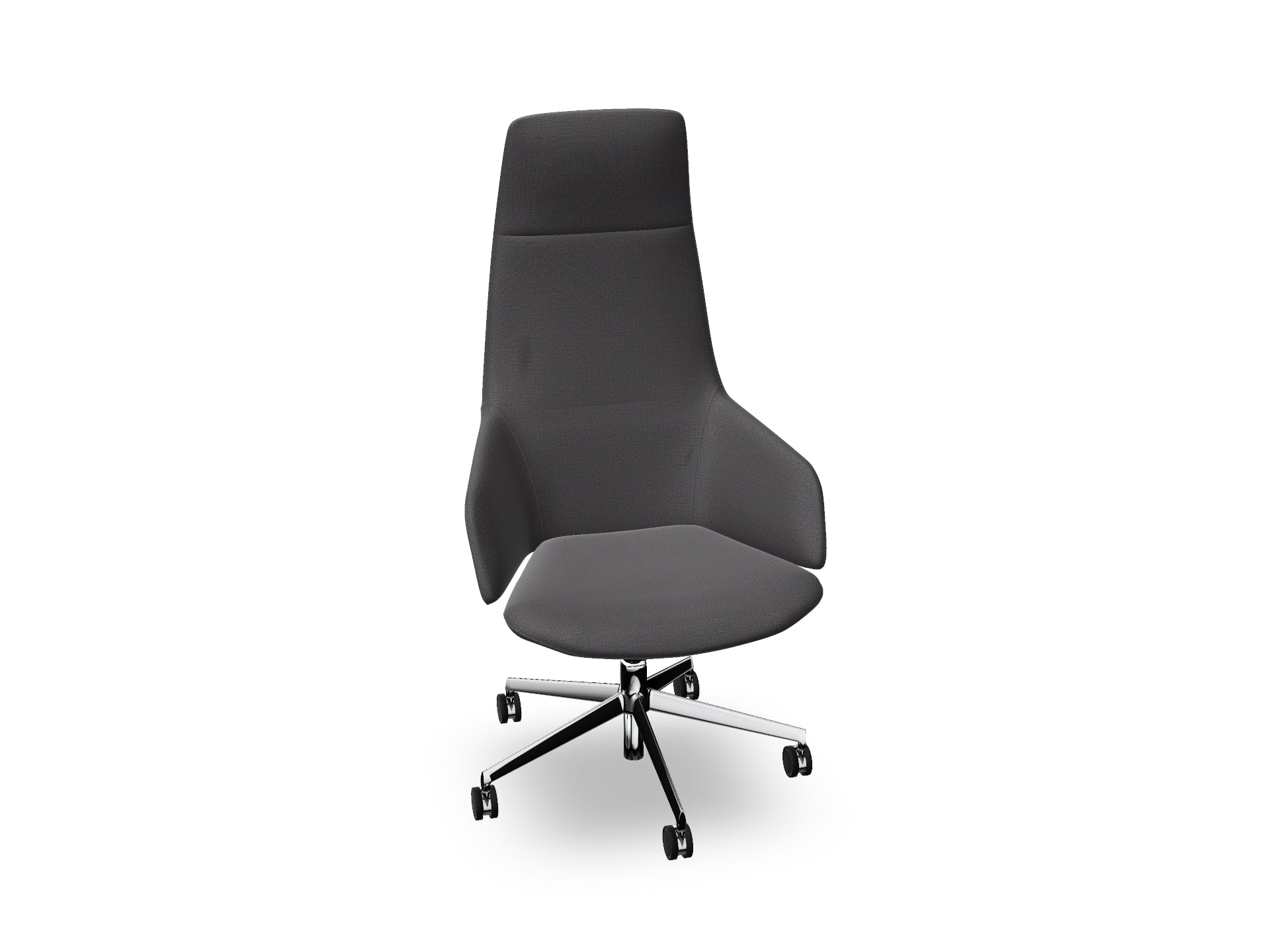 Executive armchair with aluminium five-star base mounted on selfbraking castors, equipped with gas height adjustment mechanism. The shell support and the spring providing tilt movement are available in the same finishes of the base. The polyurethane shell is upholstered in leather, coated fabric, fabric, or customer’s