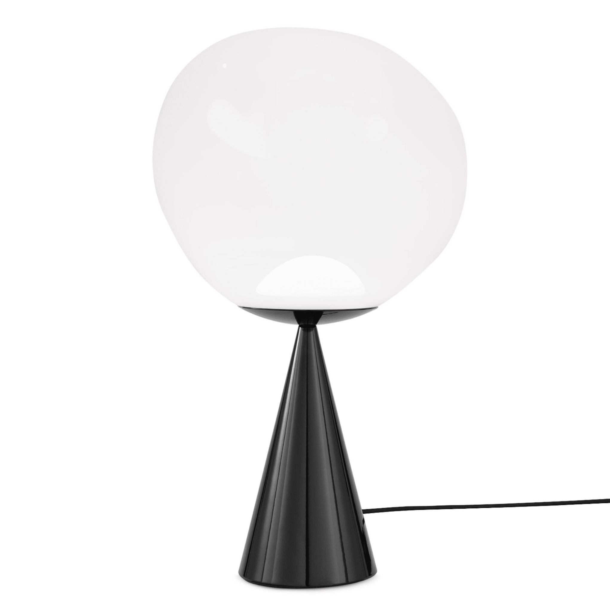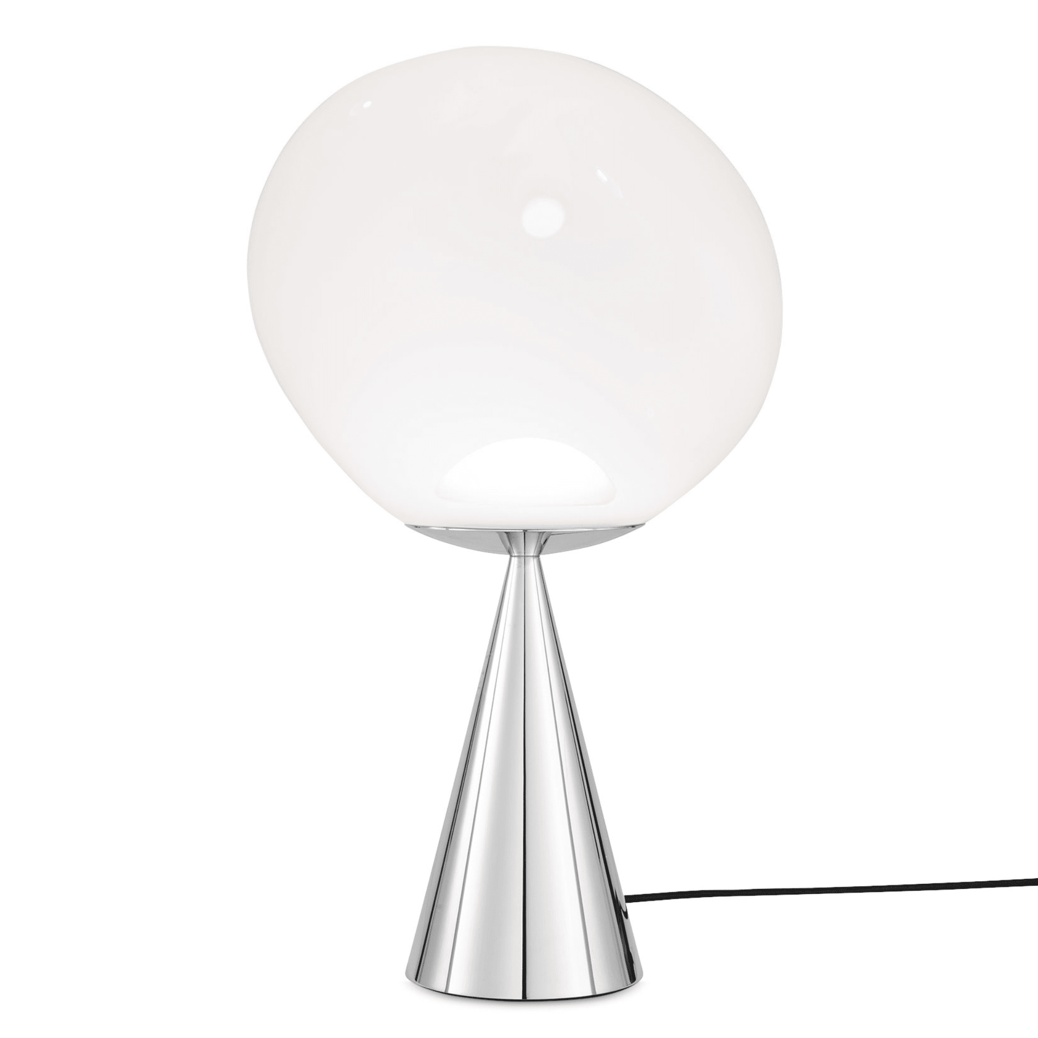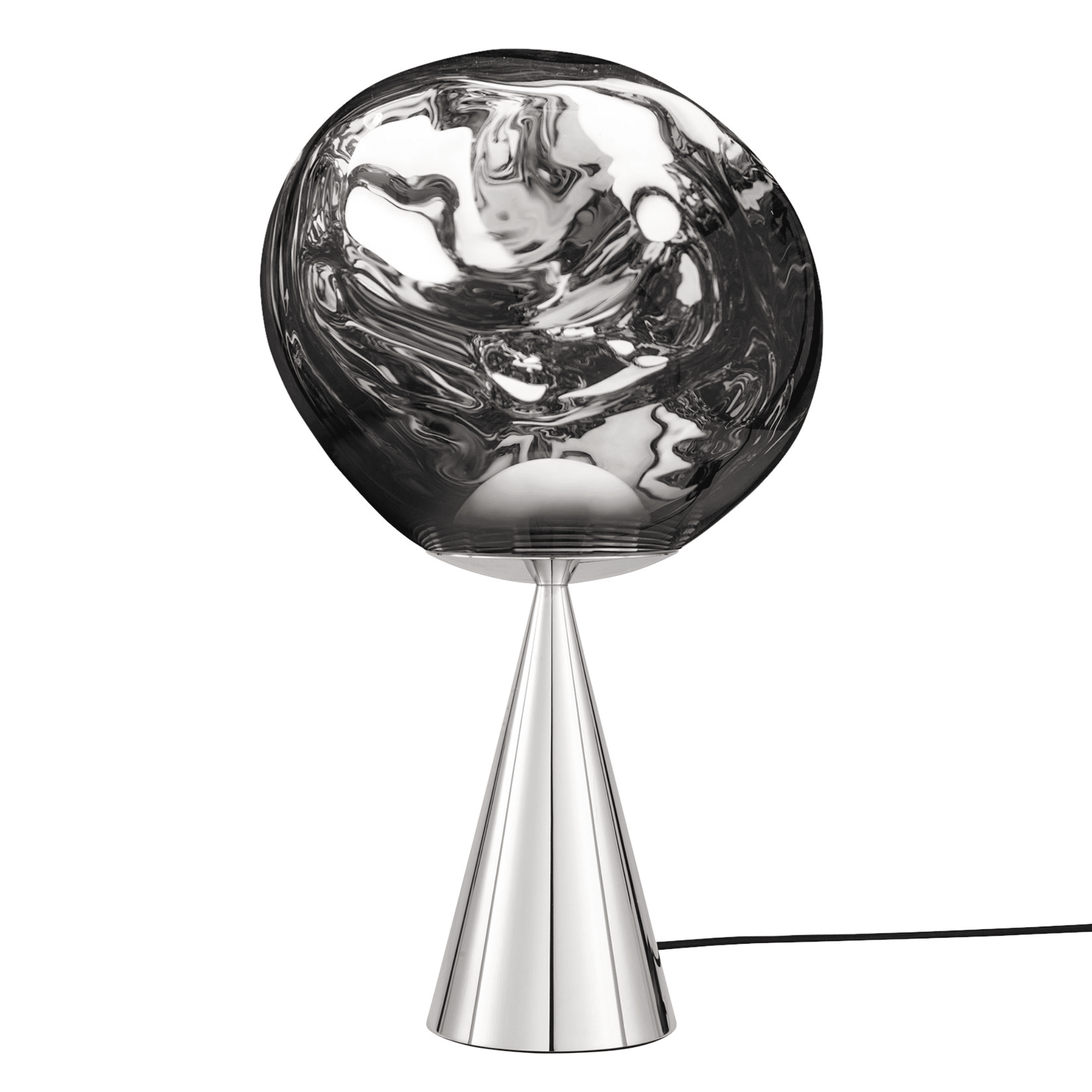 Melt is evocative of molten glass, the interior of a melting glacier or images of deep space. An imperfect, organic and naturalistic light that produces a mesmerizing hot-blown glass effect. Melt is created through a process of blow moulding and vacuum metallisation to achieve melted orbs with abundant and unusual luminosity. Here the orb sits on a cone-shaped base creating a striking silhouette.