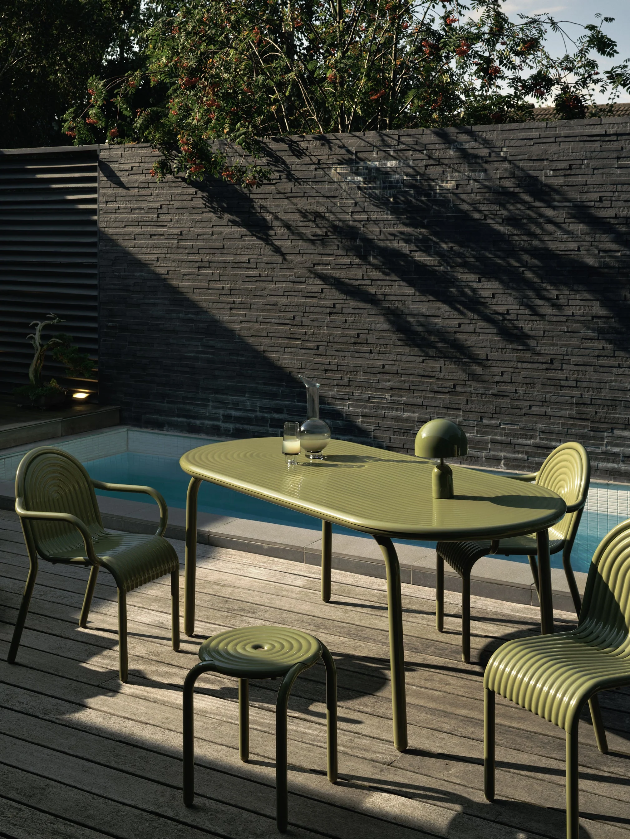 Discover the GROOVE Stool, part of Tom Dixon's first outdoor collection. Featuring distinctive art deco-style raised ridges, this stool is crafted from premium aluminium using advanced manufacturing techniques for exceptional durability. Its high-quality, powder-coated finish is solvent- and VOC-free, making it ideal for outdoor use. The GROOVE collection, refined through over a decade of research, includes versatile designs for efficient stacking and storing. Available in elegant MOSS and PUTTY shades.