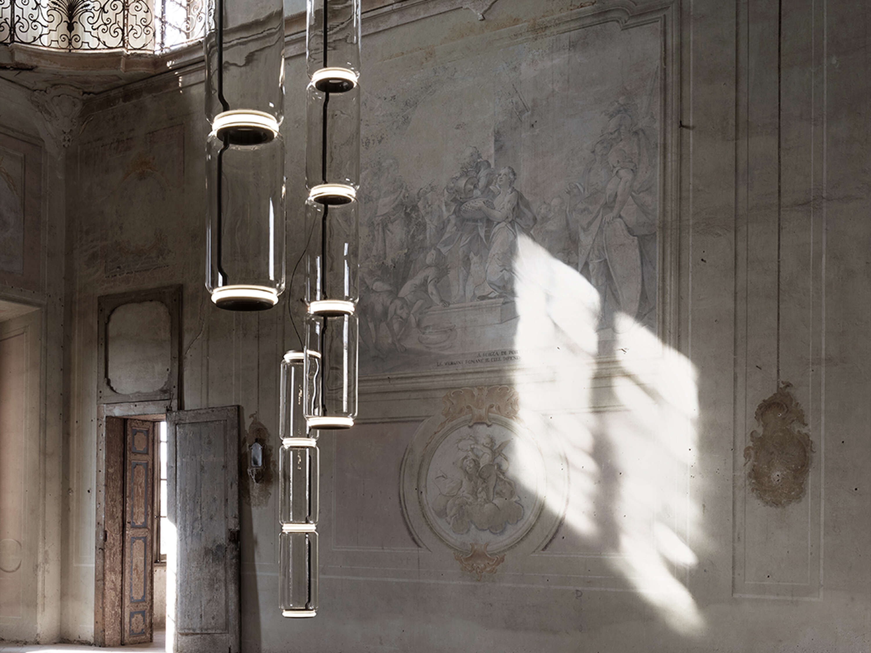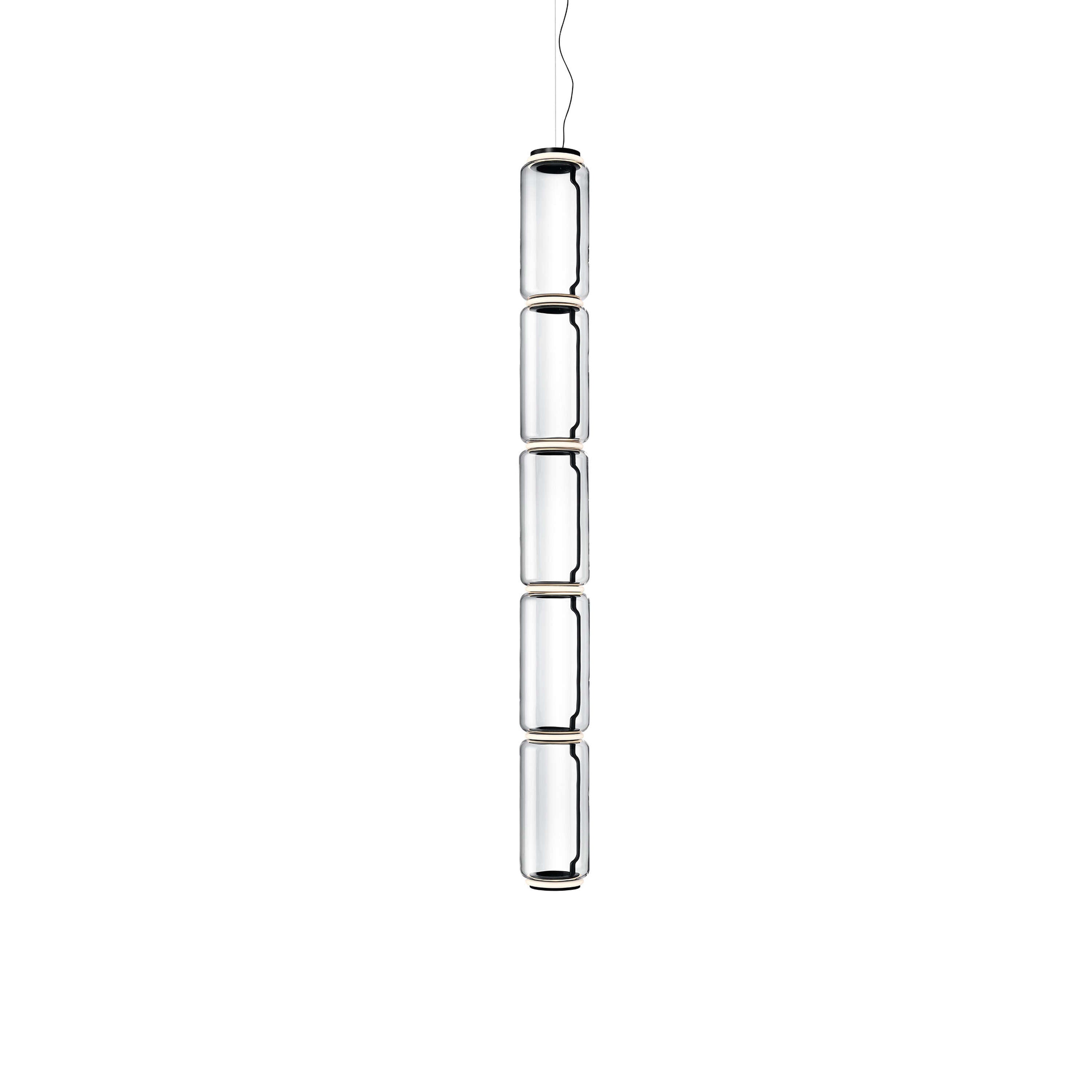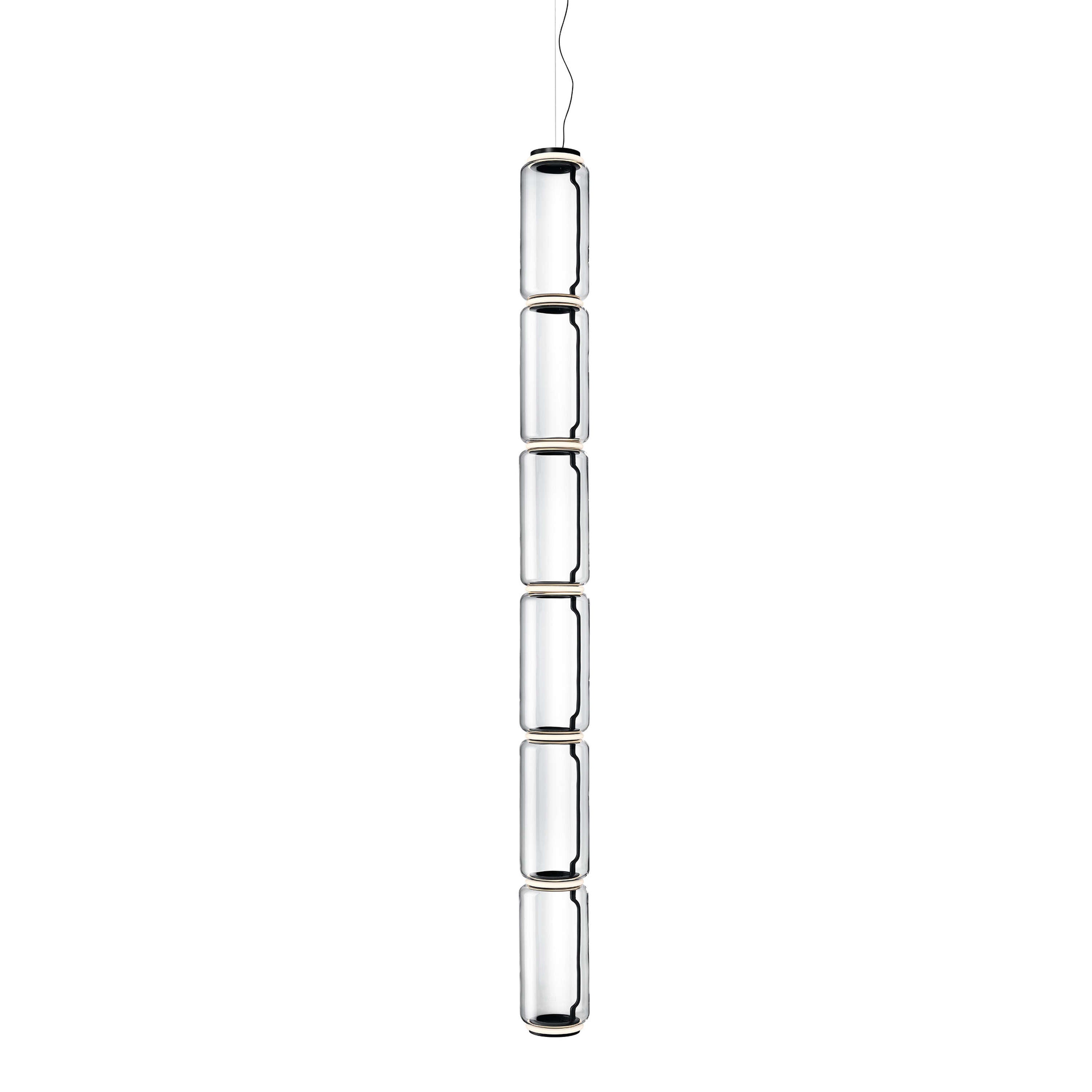 Hanging lamps consisting of interconnecting glass modules reaching a length of 3,2 mt. (126.77") with 4 mt. (157.48") suspended power cable. Cylindrical and semi-spherical transparent blown glass structure, suspended die cast aluminium ring connector, hydroformed steel internal lateral arm and injection moulded optical opal silicone outer ring diffusers. The power supply unit within the ceiling rose can be used as a dimmer to adjust the light intensity by 10% to 100% in either direction by means of the 0-10/1-10V, PUSH, DALI control.