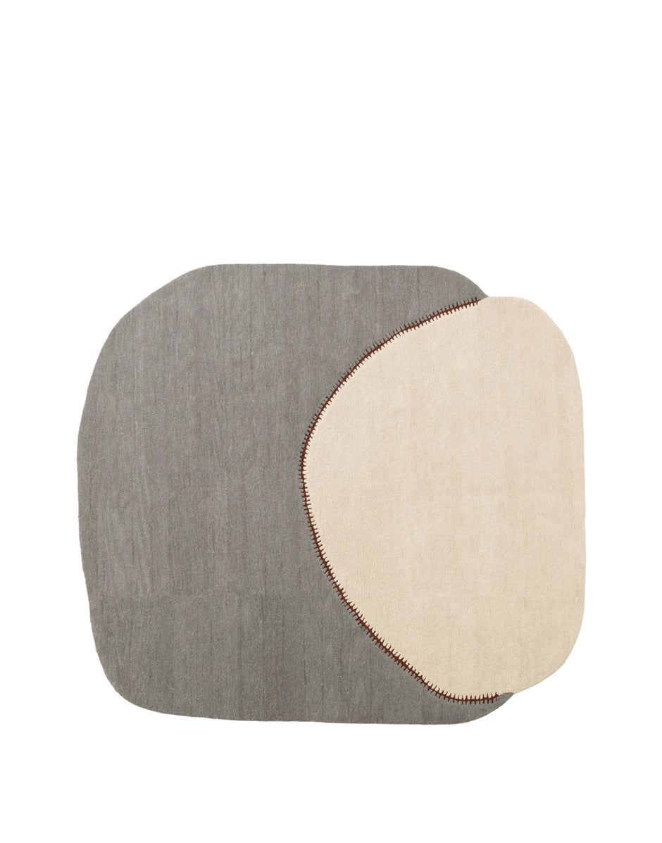 The AALAND rugs are characterized by a particularly original and distinctive graphic pattern. The design consists of two organic rounded shapes, each with different fills and textures, creating an interesting visual contrast. These two shapes, while maintaining some visual independence, are connected by a graphic element that can be interpreted as a sort of stylized suture.