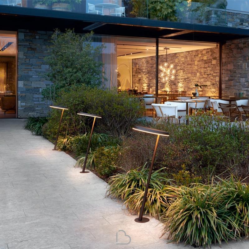 The same design, with revised proportions and modified materials and finishes, is also offered in its outdoor version. Amanita is transformed from reading lamp to an elegant outdoor path-light. The Indian brown finish of this version, together with its stylish silhouette, make it an object destined to grace the most refined gardens and public spaces.