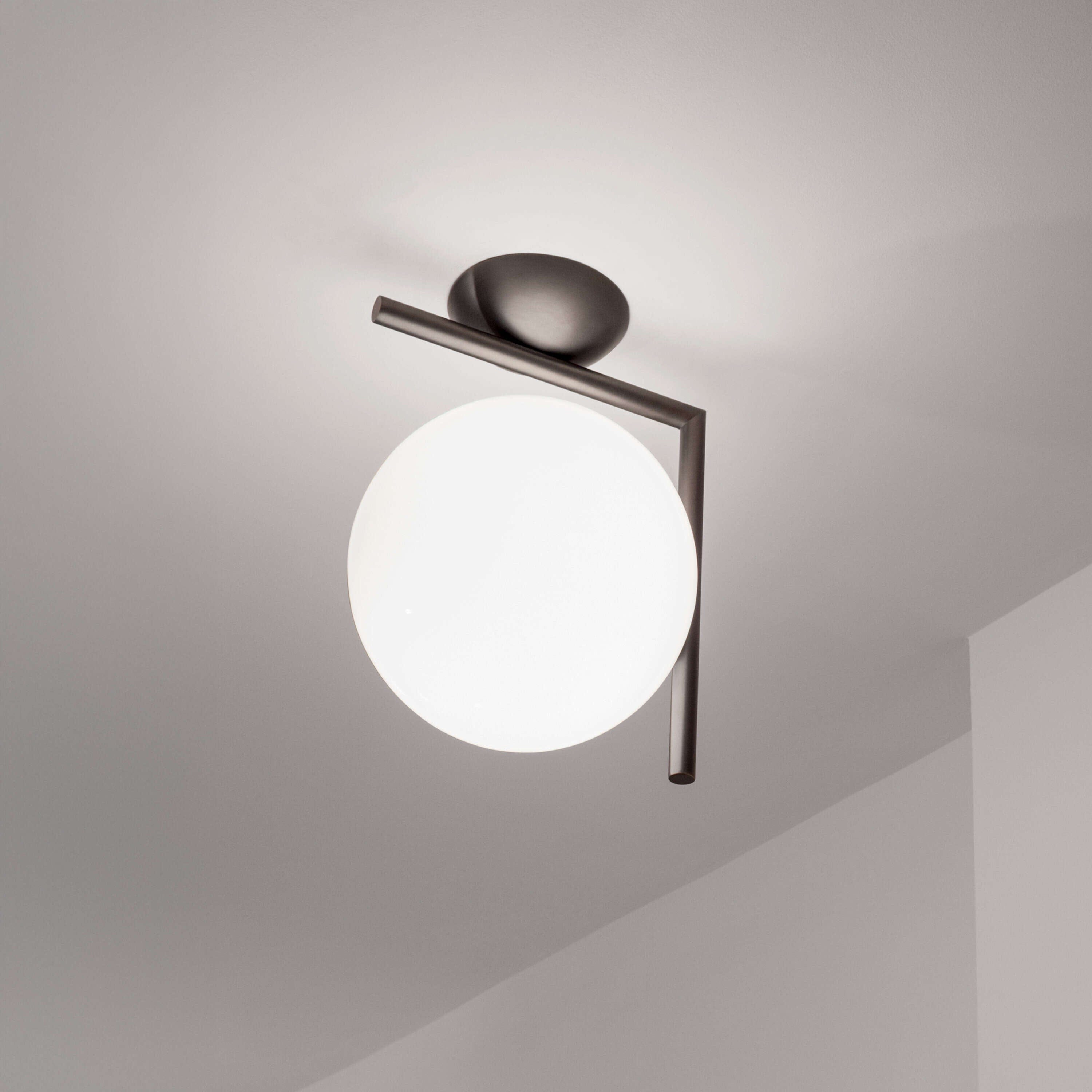 The sleek, modern ceiling lamp has a blown glass opal glass design that provides diffused lighting, which adds a serene calm to any hallway, living room or bedroom. The frame comes in brass or chrome finish steel.