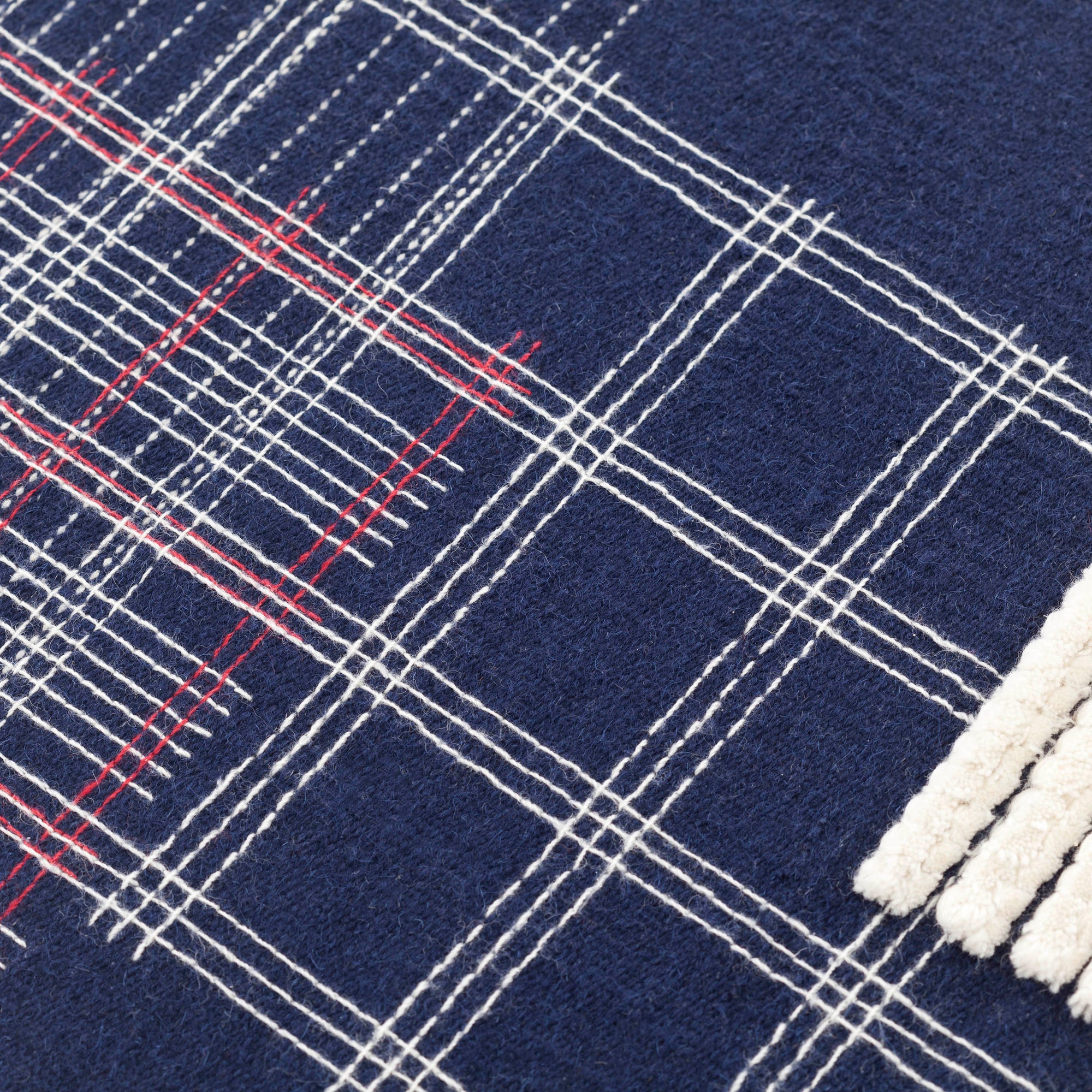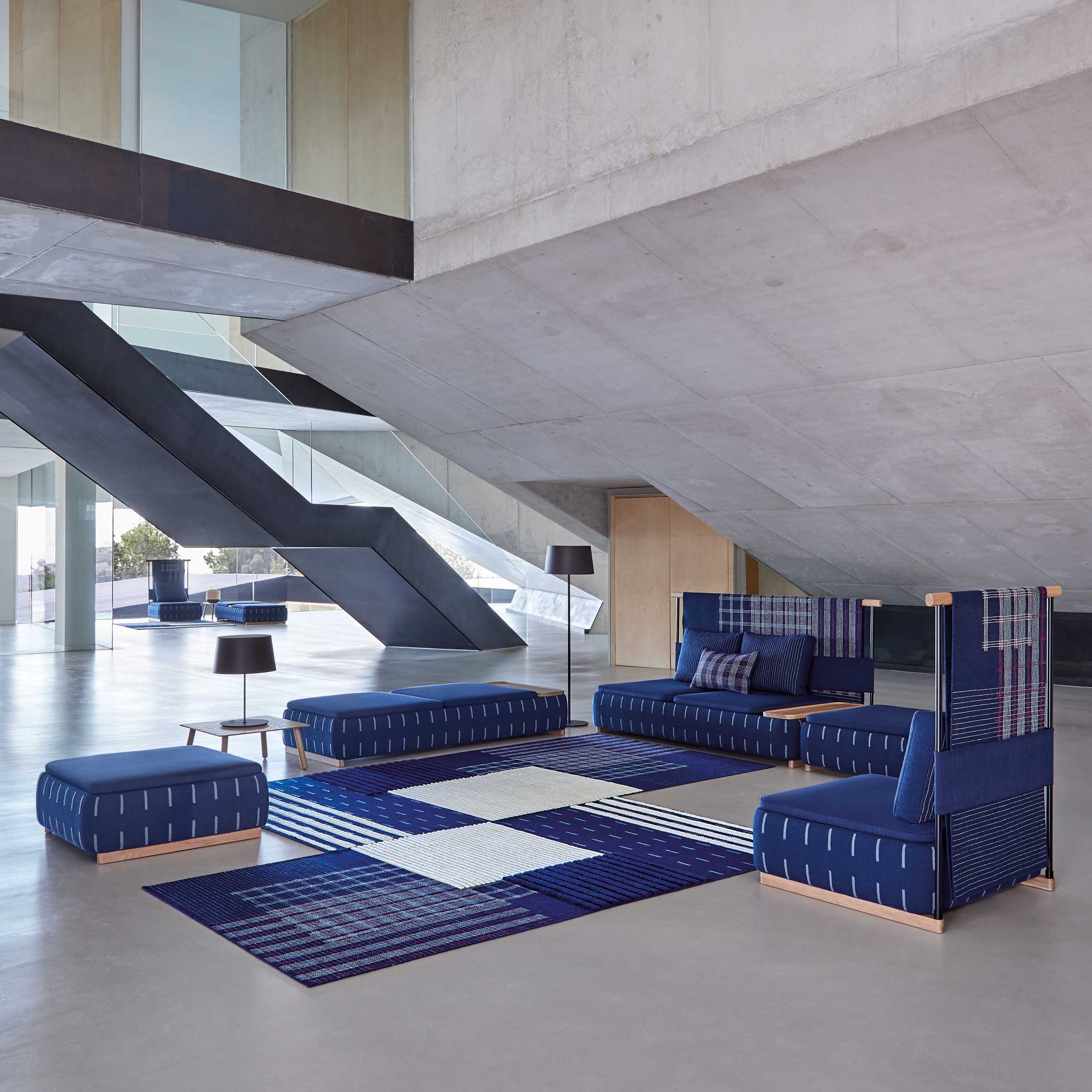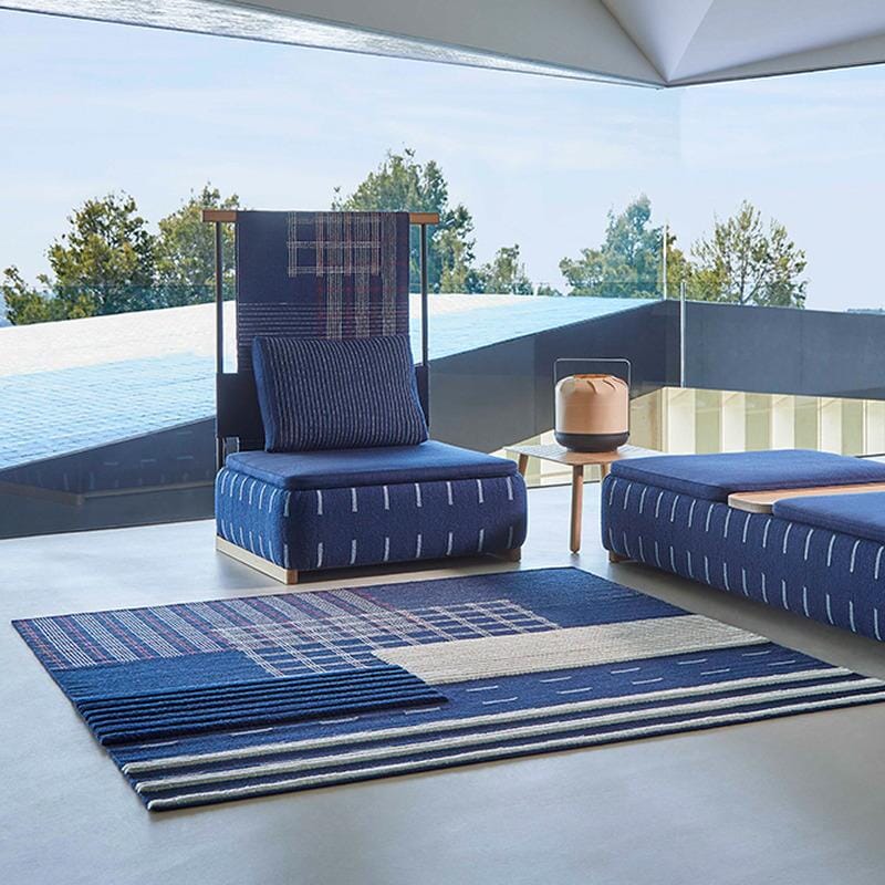 The Lan collection is a design by Chinese studio Neri&Hu. Lan is offered in a natural as well as an indigo tone from which the series originally takes its name -Lan means blue in Mandarin. Made with a base of Glaoui fabric, the great appeal of these pieces lies in their eclectic ornamentation, which alternates checkered patterns, hand-embroidered, with linear motifs of different textures and volumes.
