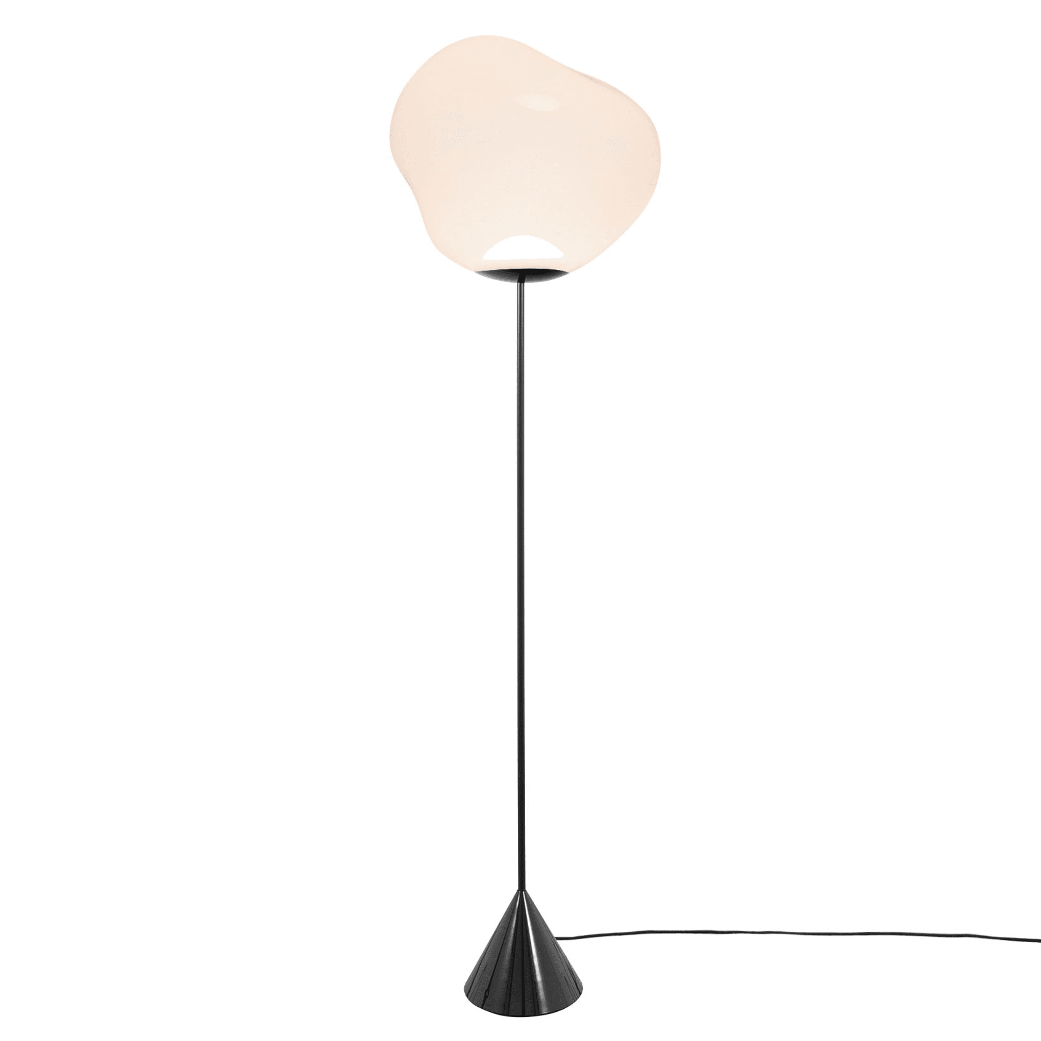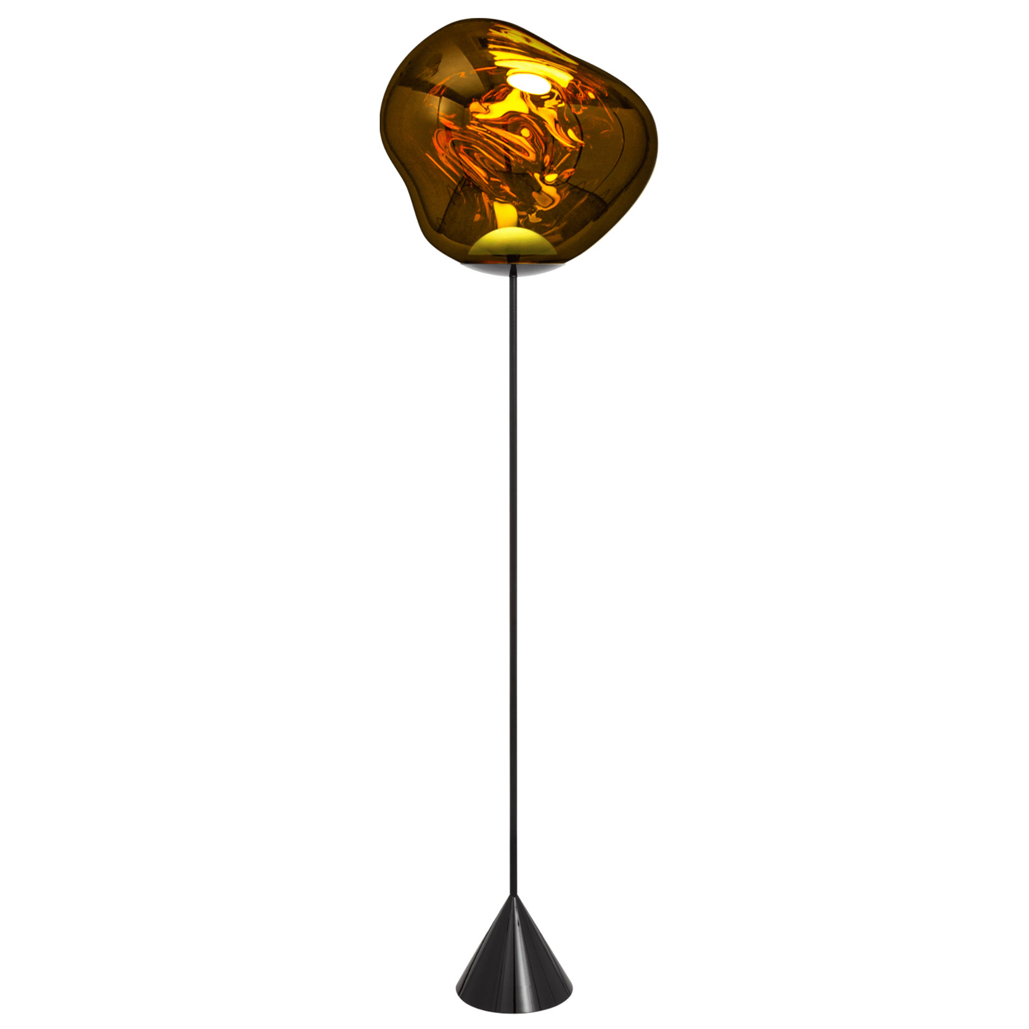 Melt Cone Slimt Floor features the iconic Melt shade, created through a process of blow moulding and vacuum metallisation to achieve the look of a melted orb with abundant and unusual luminosity. Here the orb elegantly rests on a slim conical base.