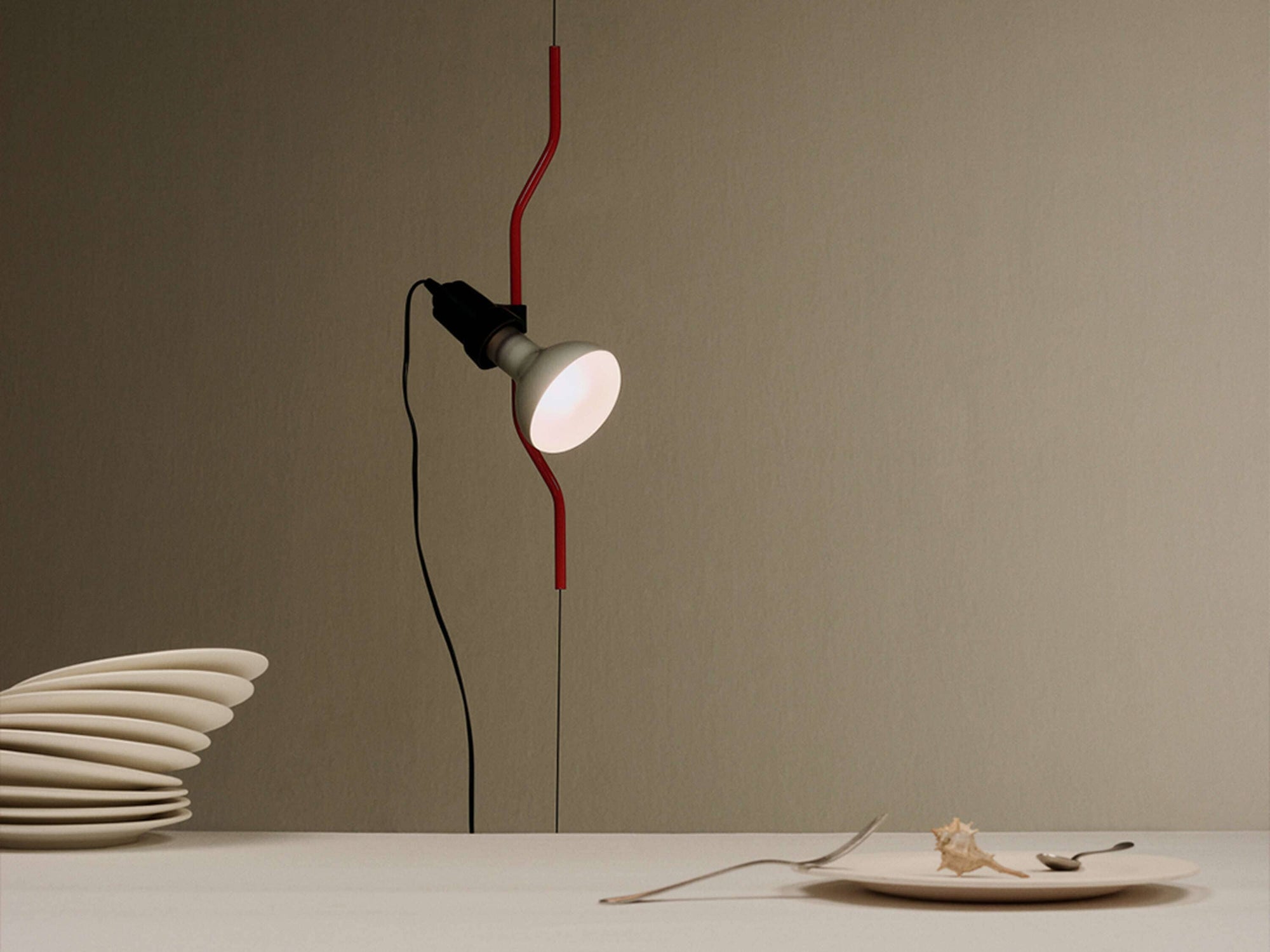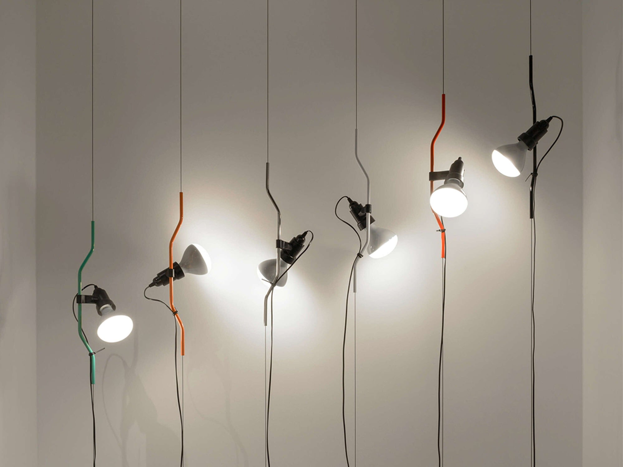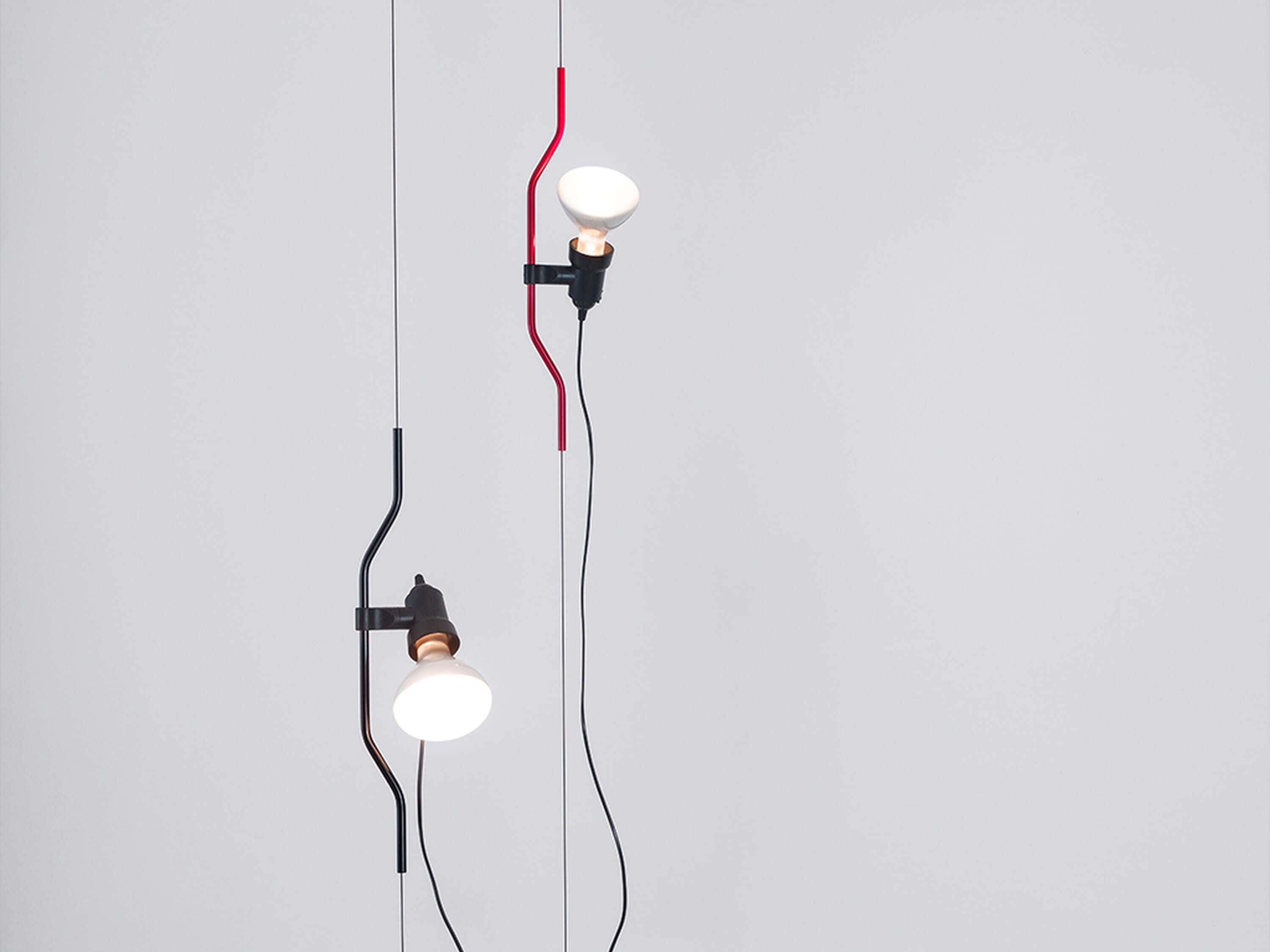 Borne out of a 1971 collaboration between Achille Castiglioni and Pio Manzù, the Parentesi was named for the parenthesis symbol—a visual reference to the nickel-plated shaped tube that lives on a floor-to-ceiling steel cable. The steel cable can reach up to 157", and the tube allows the lamp head to move vertically along the cable to achieve a customized height. The head fixture is injection-molded black elastomer, equipped with a switch.