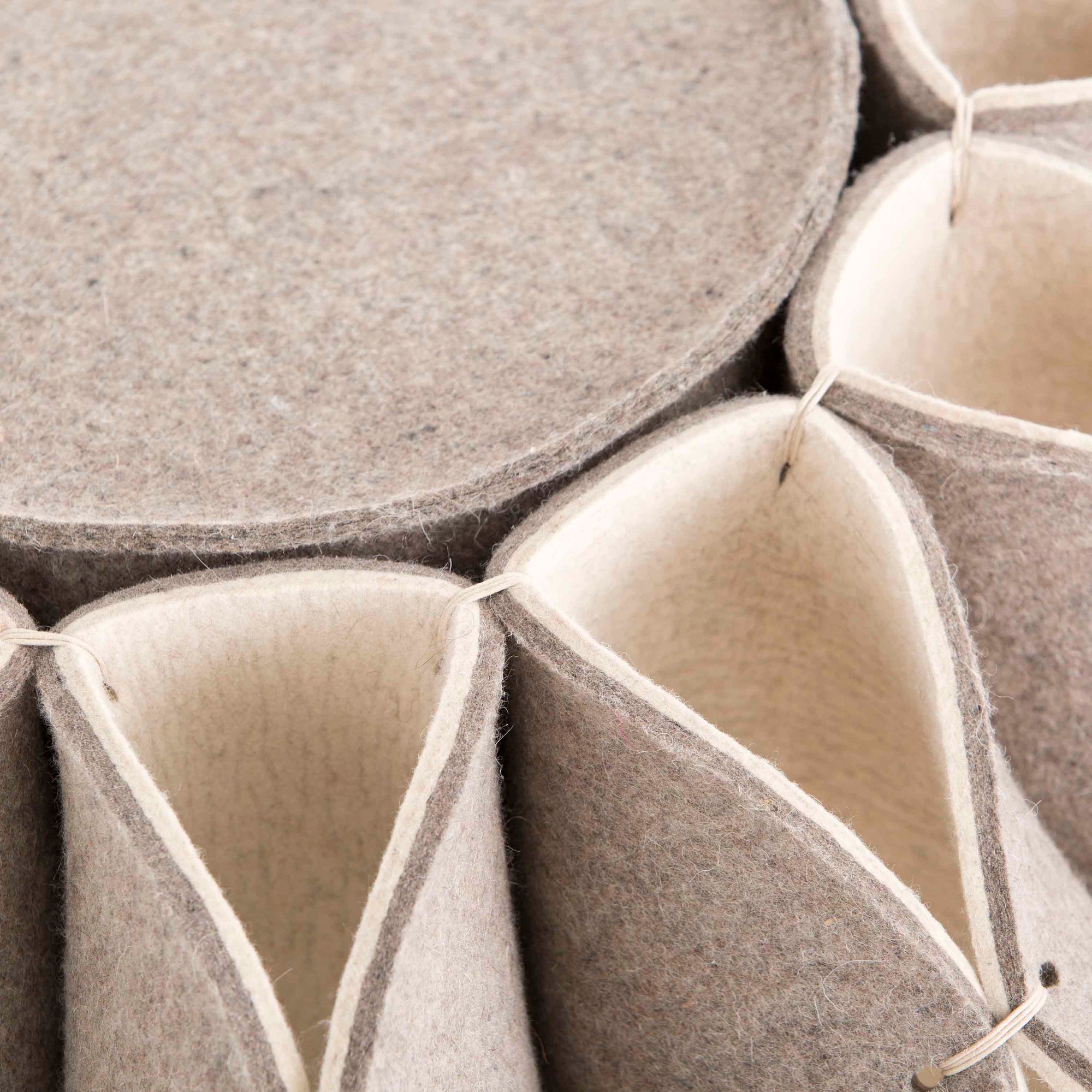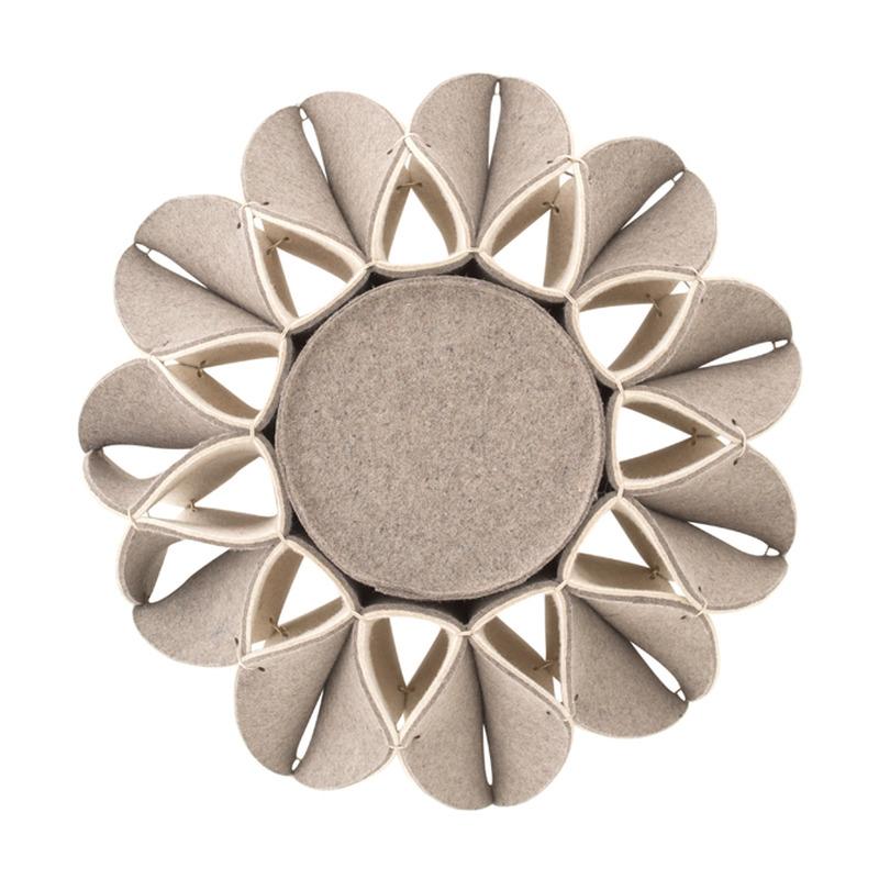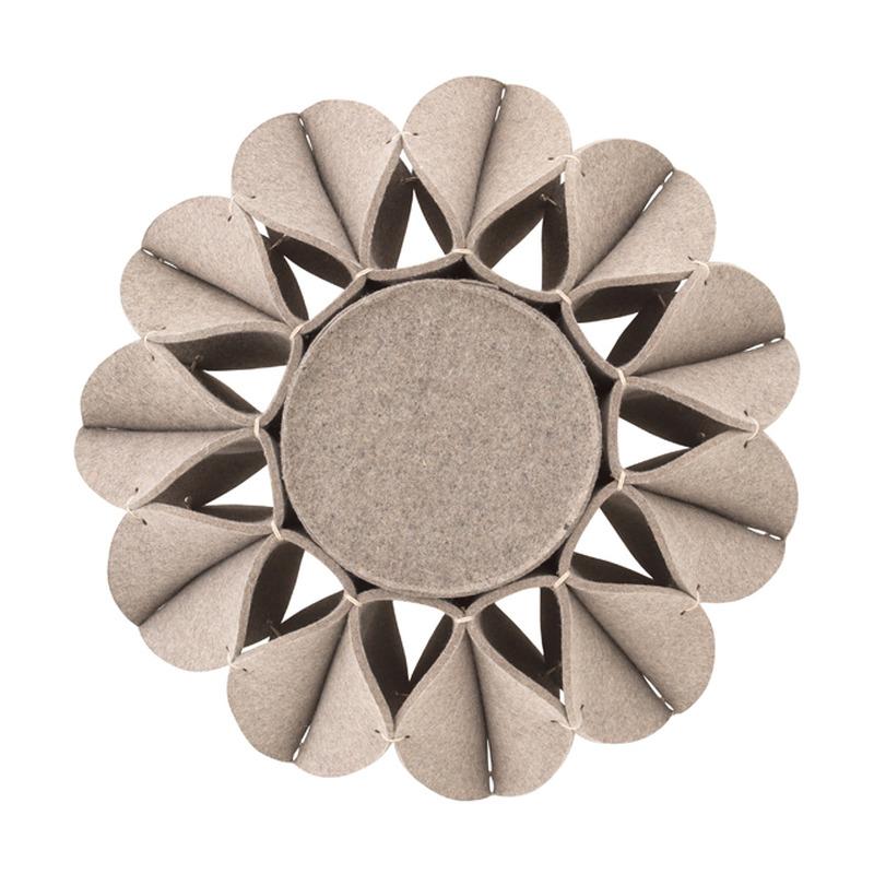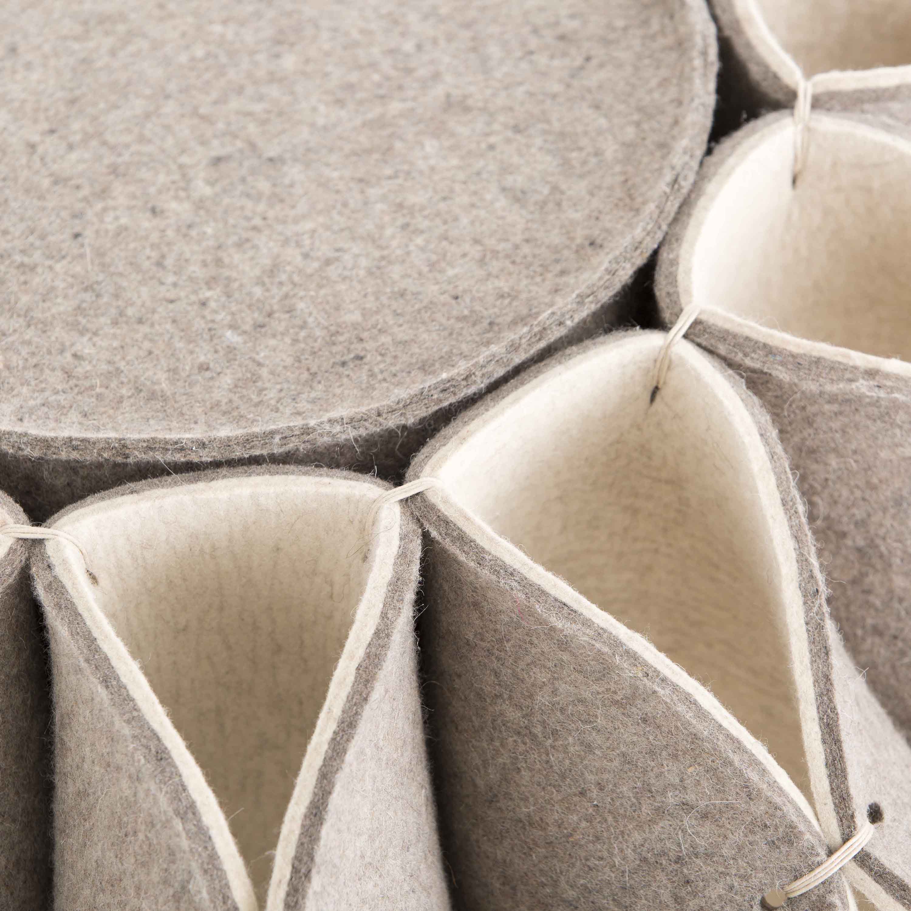 The Ruff Pouf series is composed of pouf-like elements with a voluminous ornament in the style of Elizabethan collars. This is the High pouf, made with felted wool. These poufs can be used as a seat in a living room or dressing room, as a footrest, or even as an occasional side table.