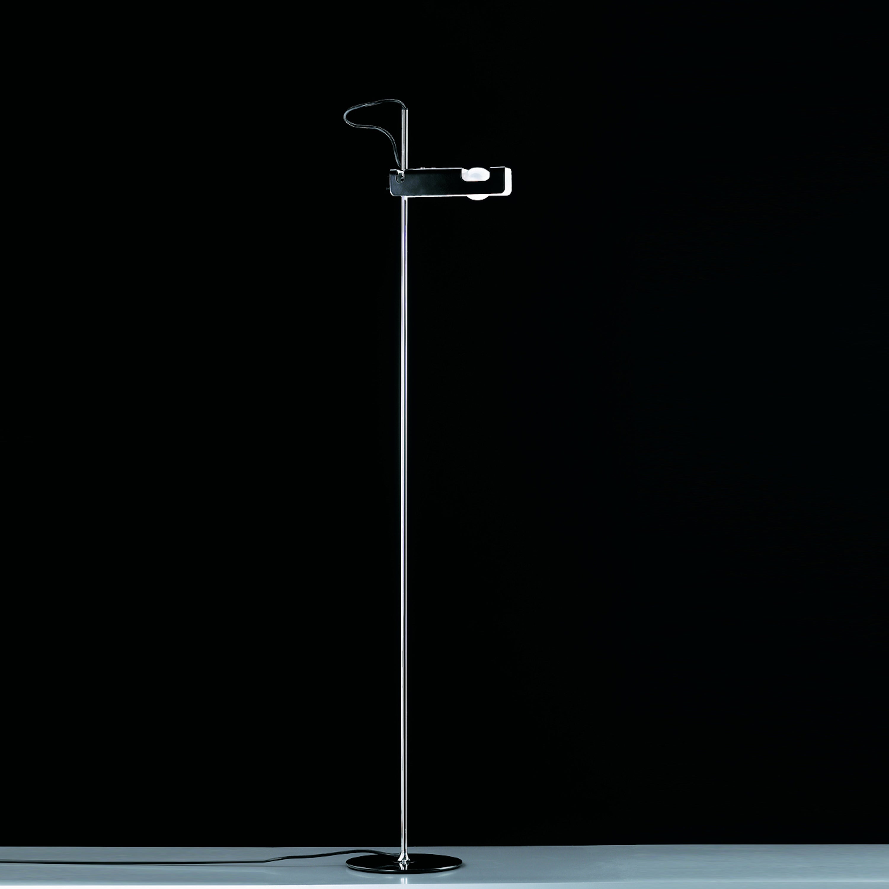 Technical data: Floor lamp giving direct light, lacquered metal base, chromium-plated stem, adjustable reflector in lacquered aluminium.