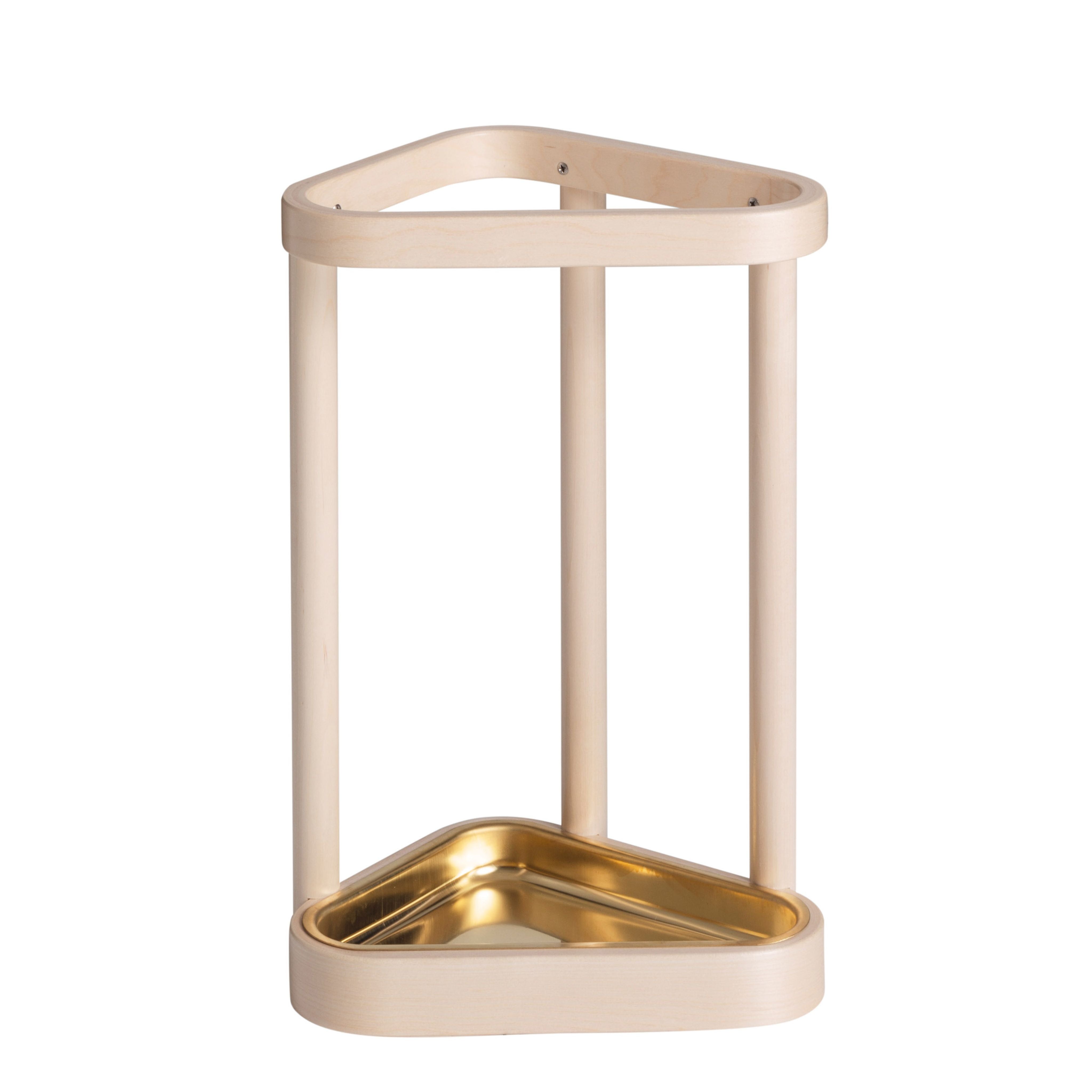 The structured, triangular design of the 115 Umbrella Stand makes it as much a beautiful accent at your front or back door as its purpose and functionality in storing wet umbrellas. Easily position the compact 115 Umbrella Stand in a small corner or tucked up against the wall. The 115 Umbrella Stand by Artek is made from natural birch and brass and the shiny brass tray at the bottom of the stand collects the excess rainwater to keep your entryway puddle-free. Made of natural Birch and ships fully assembled.
