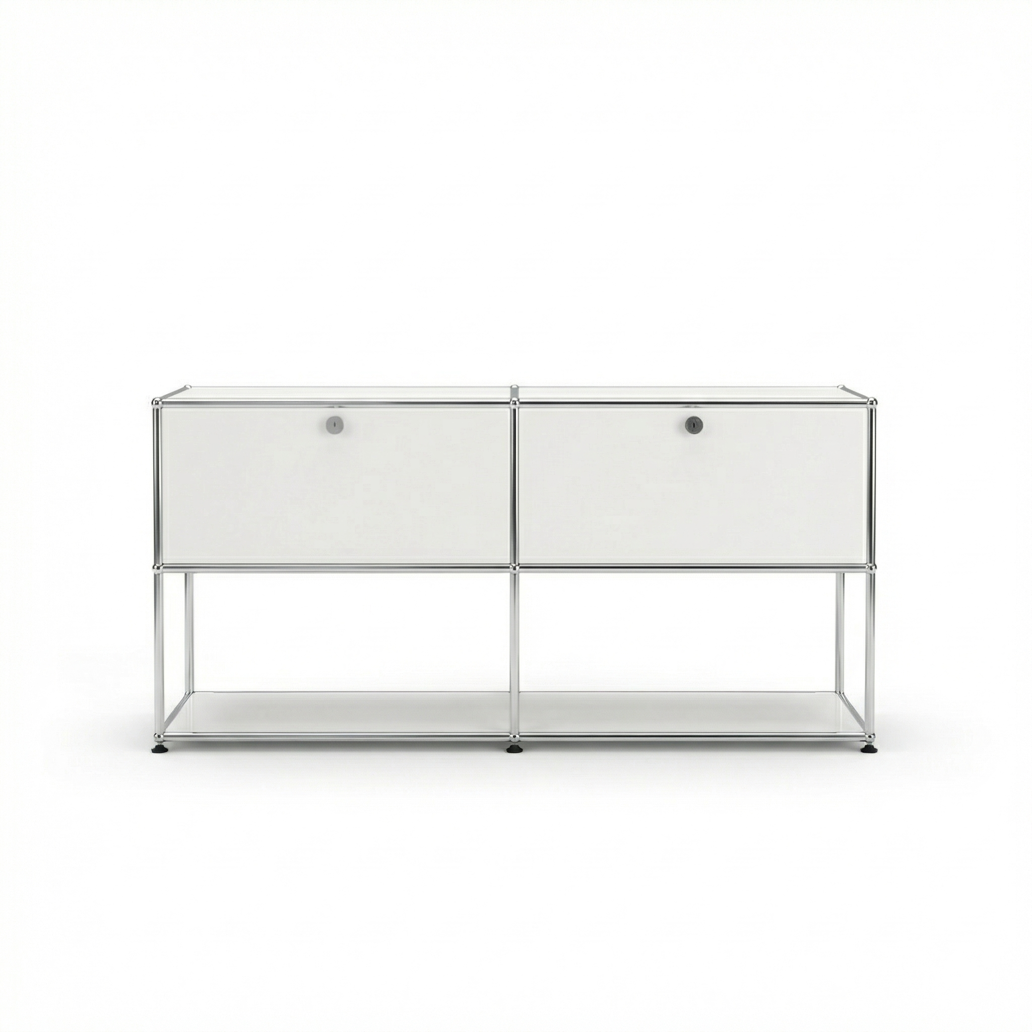 Transform your home or office with the clean lines and modular modernity of the USM Haller Credenza Sideboard F2 With 2 Doors Open Storage Base Chromed Steel Powder Coated Metal.
