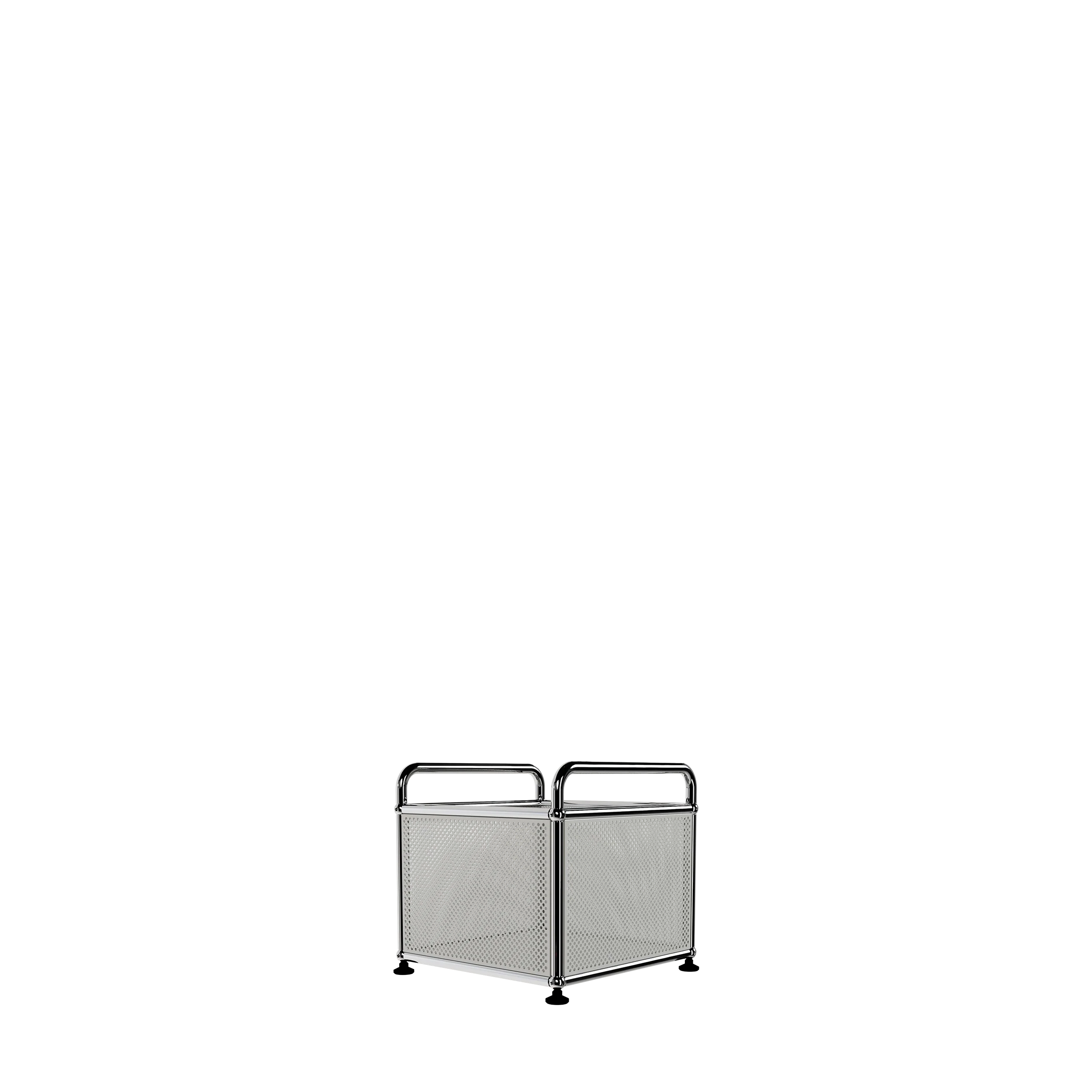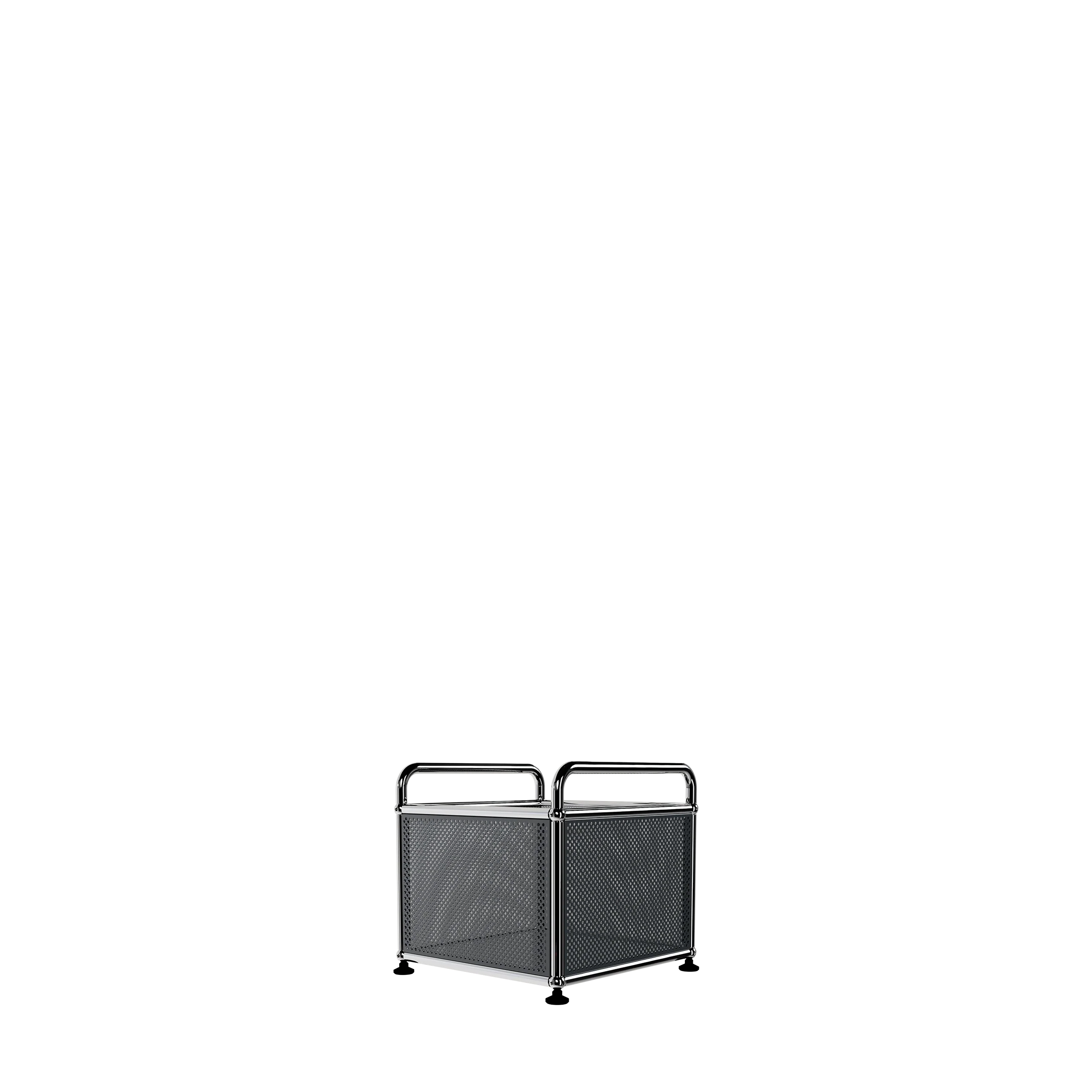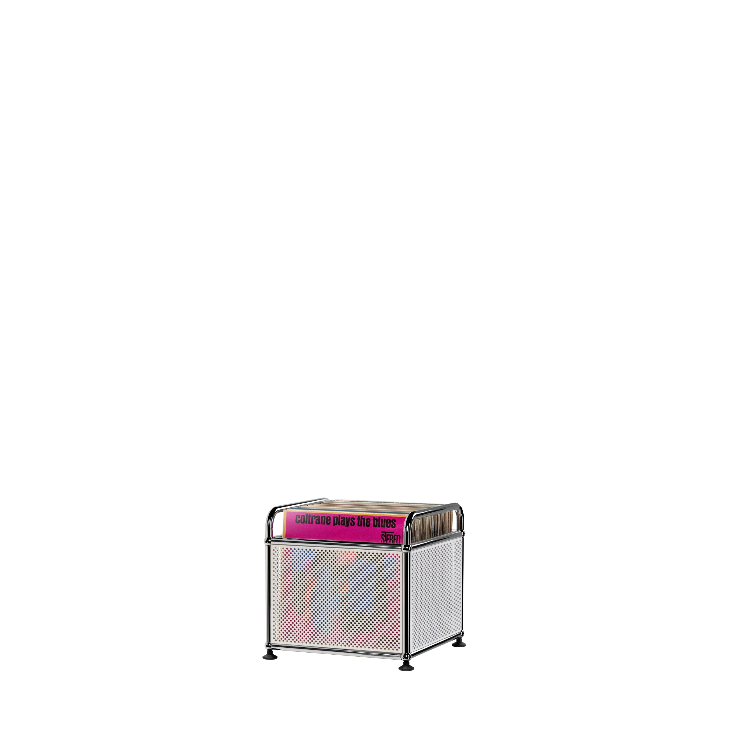 Symbol reimagined the classic milk-crate-full-of-records using USM's Swiss-made, precision engineered chrome and steel components. This best-selling record crate is customized with two handles and perforated panels. Holds up to 75 records.