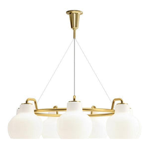 The VL Ring Crown family derives from a lamp designed by architect Vilhelm Lauritzen for the Danish Broadcasting House in Copenhagen in the 1940s. The wall lamp and pendant versions, with the characteristic organic form, were put to good use at the Danish Broadcasting House. For this project Vilhelm Lauritzen also created the VL38 and VL45 lamps. The original VL Ring Crown never appeared there, but not long after, a Ring Crown based on the original drawings was launched. In 1947, the designer Finn Juhl, who worked for Vilhelm Lauritzen, used the VL Ring Crown as part of the interior design for the Danish porcelain manufacturer Bing & Grøndahl in Copenhagen. True to its original materials and design, the VL Ring Crown was reintroduced in 2019. It’s made of untreated, polished brass and with three, five or seven shades in glossy white, triple-layered, handblown opal glass. It was complemented by the wall lamps and pendant originally installed in the Danish Broadcasting House. The VL Ring Crown family brings a distinct and authentic touch to stylish interiors as well as a warm light to softly illuminate contemporary living.